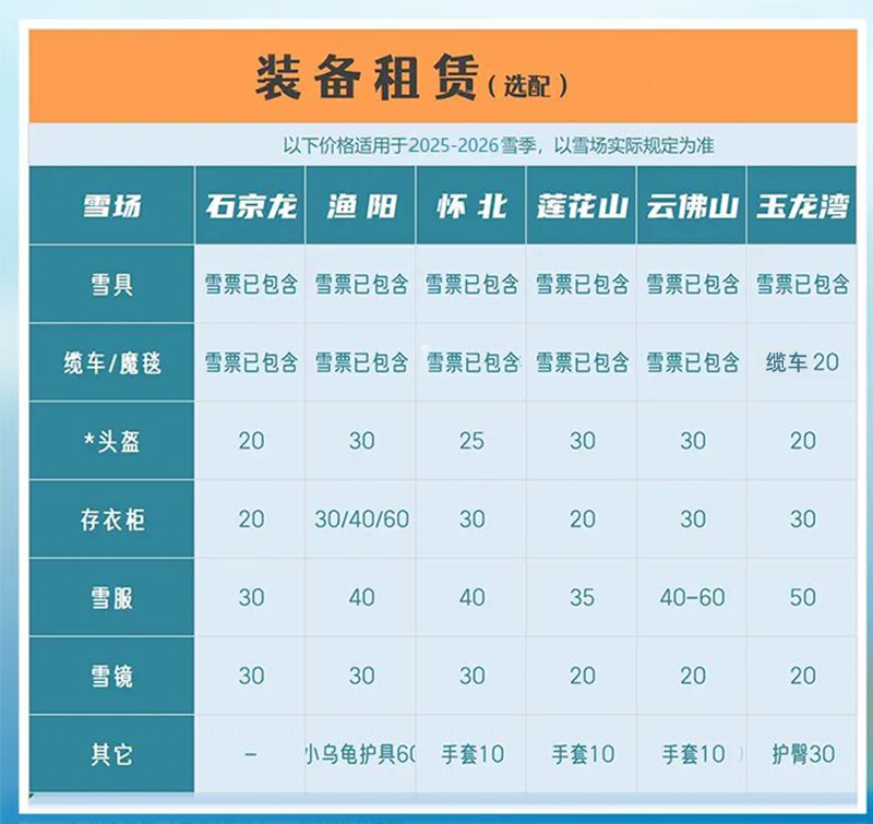 1)自愿租赁:头盔、雪服、雪镜、手套、衣柜等,租赁价格以各雪场实际规定为准(一般雪场强制必须租赁头盔);