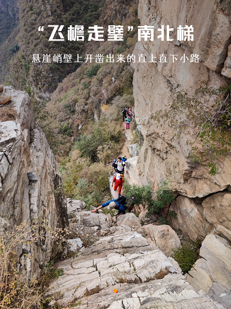南北梯坐落于北京房山区的圣水峪村,那是一个站在山上看下去错落有致的村庄,白天会看见他们在田地里忙碌的身影。错落在山脚下,顺着梯形的山势不断地盘旋上升。南北梯也是北京户外十大夺命线路之一,其危险系数不在铁陀山之下。