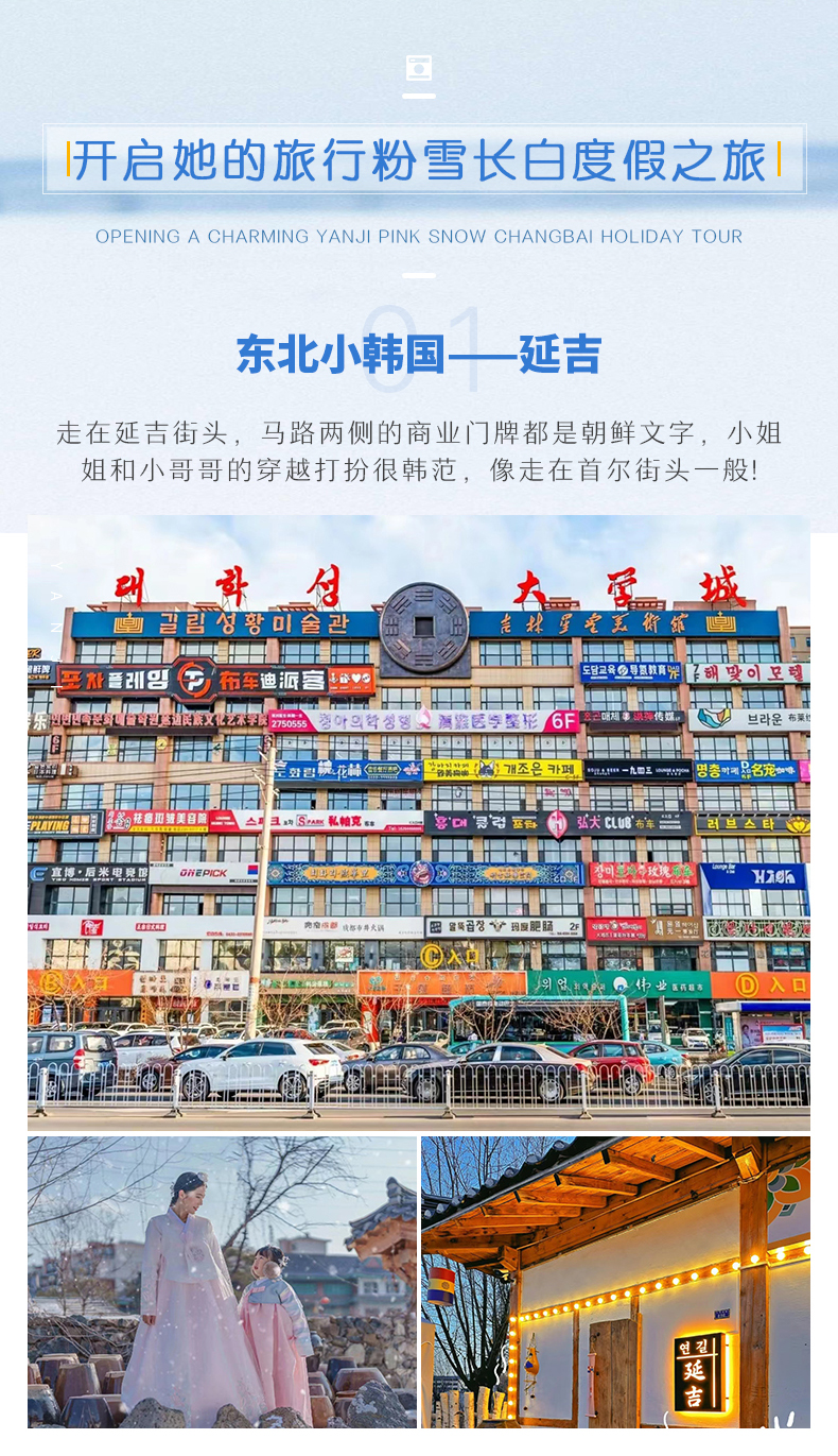 延吉市是延边朝鲜族自治州的首府,这是一个充满韩范的城市,朝鲜族比例占一半以上,汉族这里是少数民族。走在延吉街头,马路两侧的商业门牌都的朝鲜文字,人们的穿越打扮也像是首尔街头。冰雪旅行,是美好而浪漫的事情。