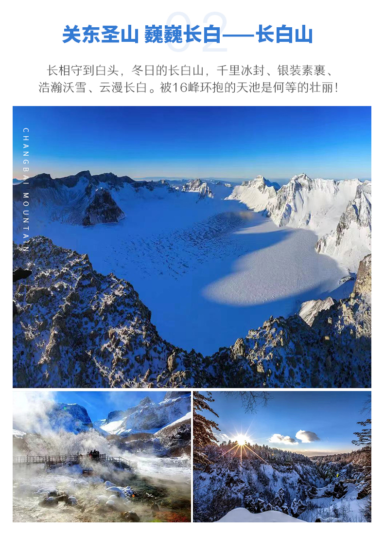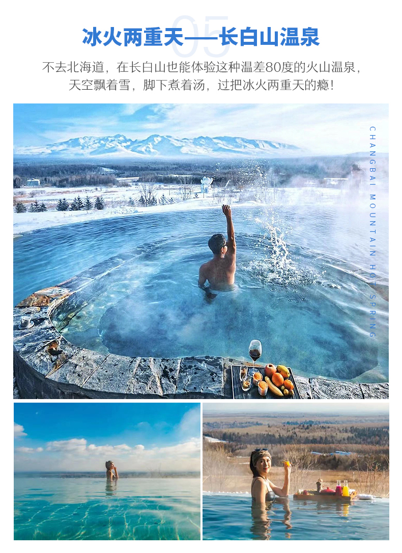 √ 游览09:30-17:00 ,快来一睹长白山绝美雪景吧!此时神秘「天池」凝结成冰,白雪覆盖。「长白瀑布」镶上了厚厚的白边,叮咚的飞瀑变成了晶莹的冰瀑从天而降,其势雄浑,虽无声却胜过有声,颇为壮观。周围是一片银装素裹,冰天雪地,而「聚龙温泉群」这里却是热气腾腾,烟雾袅袅,可行走于栈道从各个角度欣赏这五颜六色的温泉带,还可品尝用温泉水煮的鲜嫩鸡蛋。还有「绿渊潭」、「地下森林」等景点银装素裹、分外妖娆,如童话世界。