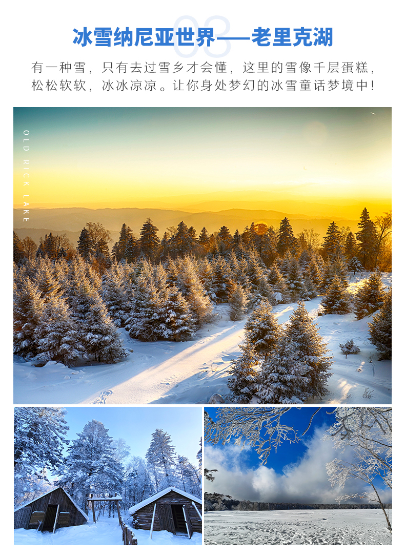 √ 车程12:30-14:00,前往【老里克湖】,老里克湖于和安图县的老里克山顶海拔1470米,每年西伯利亚南下的寒流和日本海北上的暖流在这里交汇,形成了厚实的降雪锋面因此,这一区域降雪频繁、雪量极大,平均厚度1米以上,独特的气候是这里构成雪松、树挂、雾凇等景观,堪称世间奇景,美轮美奂。
