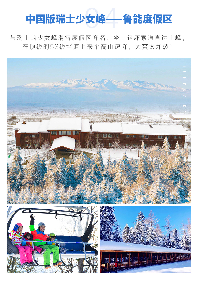 √ 车程16:00-18:00,前往长白山【鲁能滑雪度假区】,入住瑞士酒店可远眺超大的雪场,近观瑞士木屋,度假的气息在这里体现的淋漓尽致,如果您是个酒店控、爱颜值、爱拍照、爱滑雪,那这里一定会满足您所有期待。办理好入住后就可以自由活动啦。