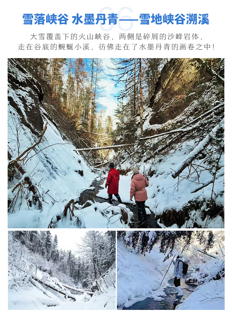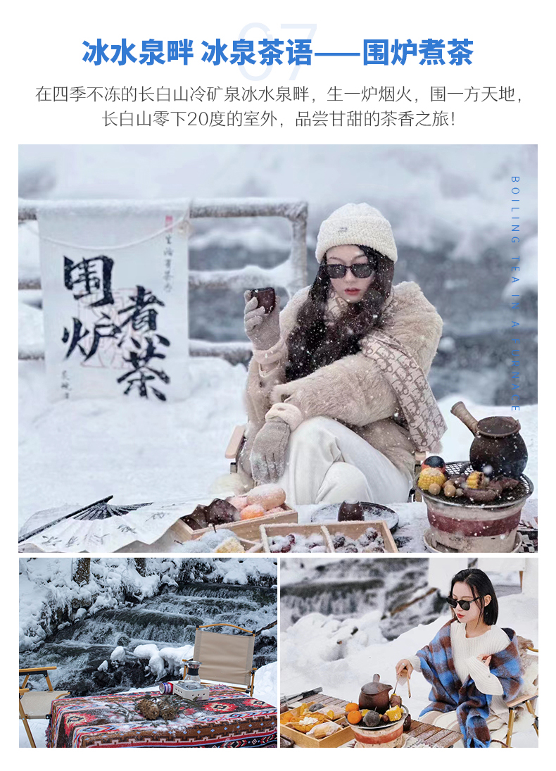 √ 游玩08:40-11:40,大雪覆盖下的长白山火山峡谷,两侧是碎屑的沙峰岩体,「雪地溯溪」在谷底的蜿蜒小溪,彷佛走在了水墨丹青的画卷之中!跟随经验丰富的向导,深一脚浅一脚地探索这片火山领域。沿途的美景以及小关卡,构成了独一无二的趣味体验。最后抵达「冰水泉」,这里由百涌泉、连珠泉、拱水泉等大小上百个泉眼四季不冻!清澈透明被称为”长白山下第一泉“。「围炉煮茶」,生一炉烟火,围一方天地,长白山零下20度的室外,品尝甘甜的茶香之旅!