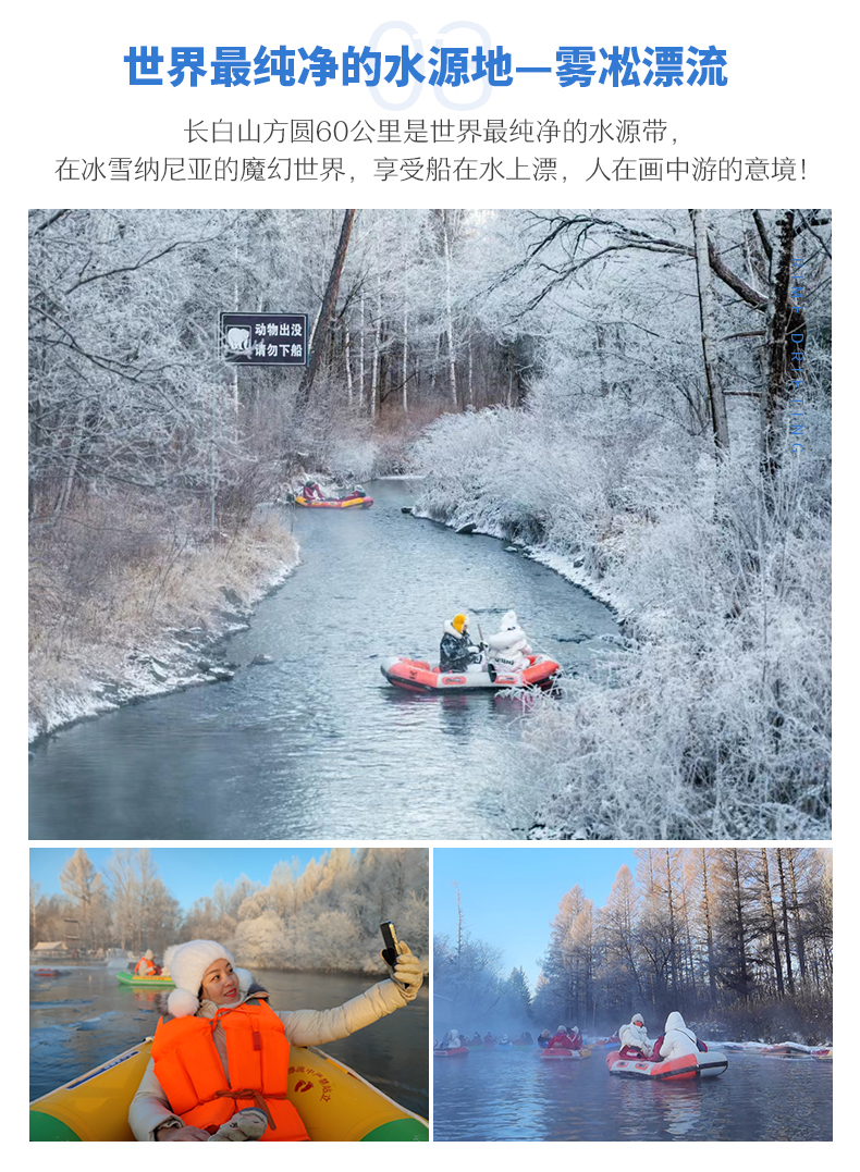 √ 漂流06:15-07:15,乘皮筏体验「雾凇漂流」顺流而下,边欣赏独特的雾凇,边享受漂流的激情与刺激,一定有一种别样的感觉。
