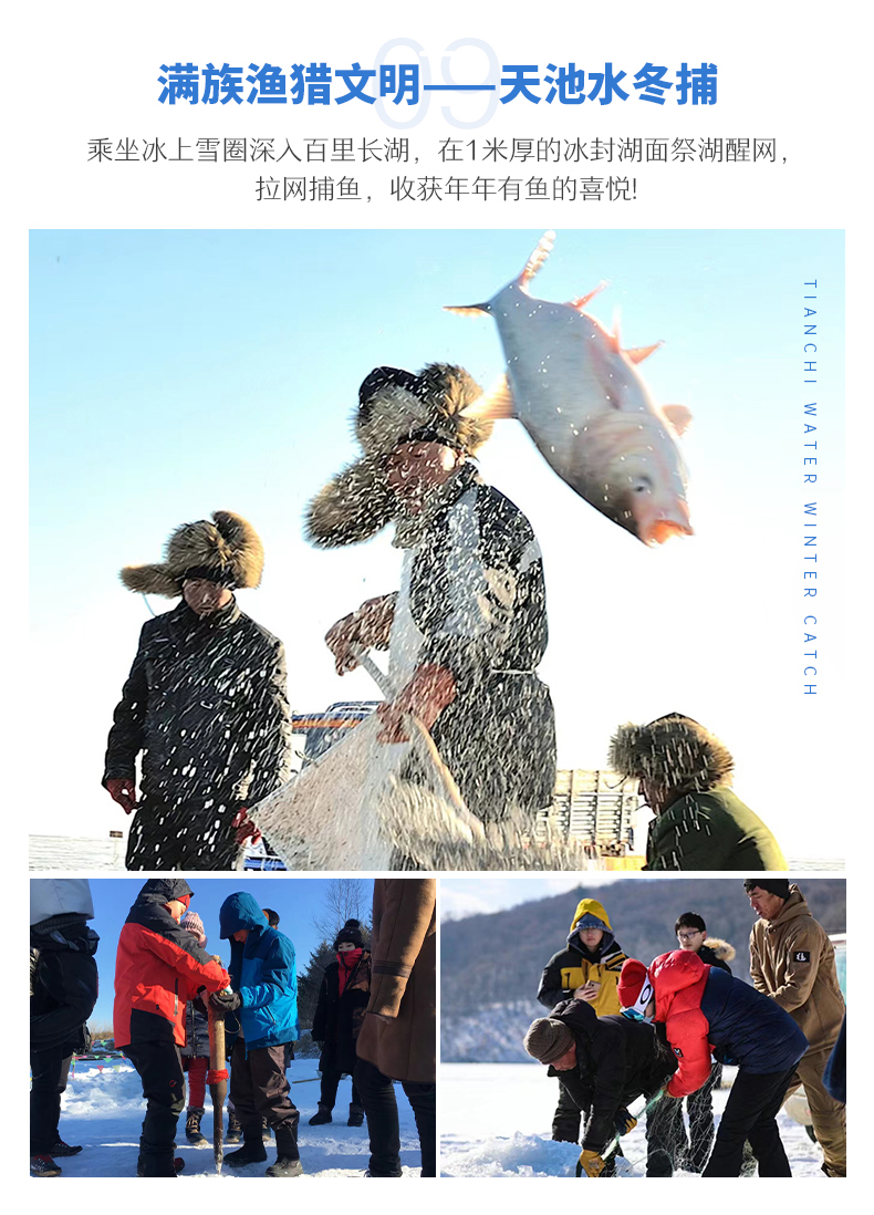√ 游玩14:20-16:00 ,赏传统渔猎「天池水冬捕」,冬捕是东北地区独特的一种捕鱼方式。在一米多深的冰面上凿洞下网,随着一个个东北汉子卖力呼喊与拖拽,一条条肥硕的大鱼不断的随网而出。您可以尝试着与渔民一同收渔网、抓头鱼,感受冰腾湖鱼的壮观场面和年年有余的美好祝愿!体验惊险刺激的「雪地长龙」,丰富有趣的冰上活动「抽冰嘎」、「碰碰球」、「冰上爬犁」。