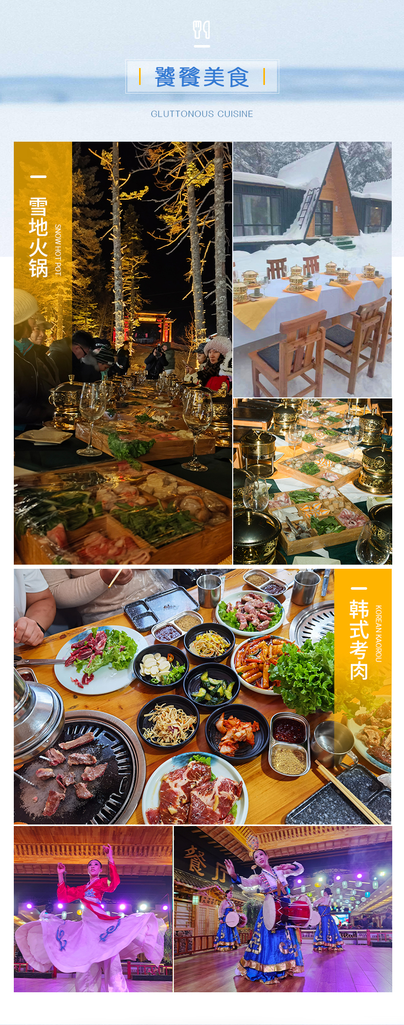 【餐 饮】:4早餐,2特色餐(雪地火锅,韩式烤肉)