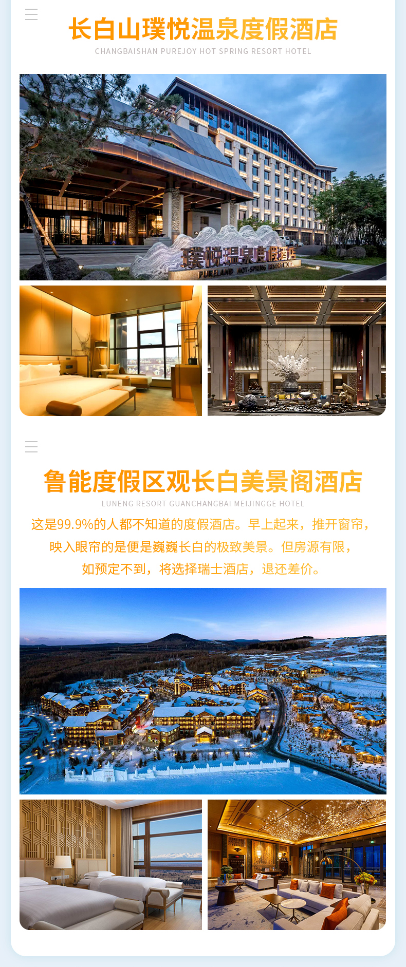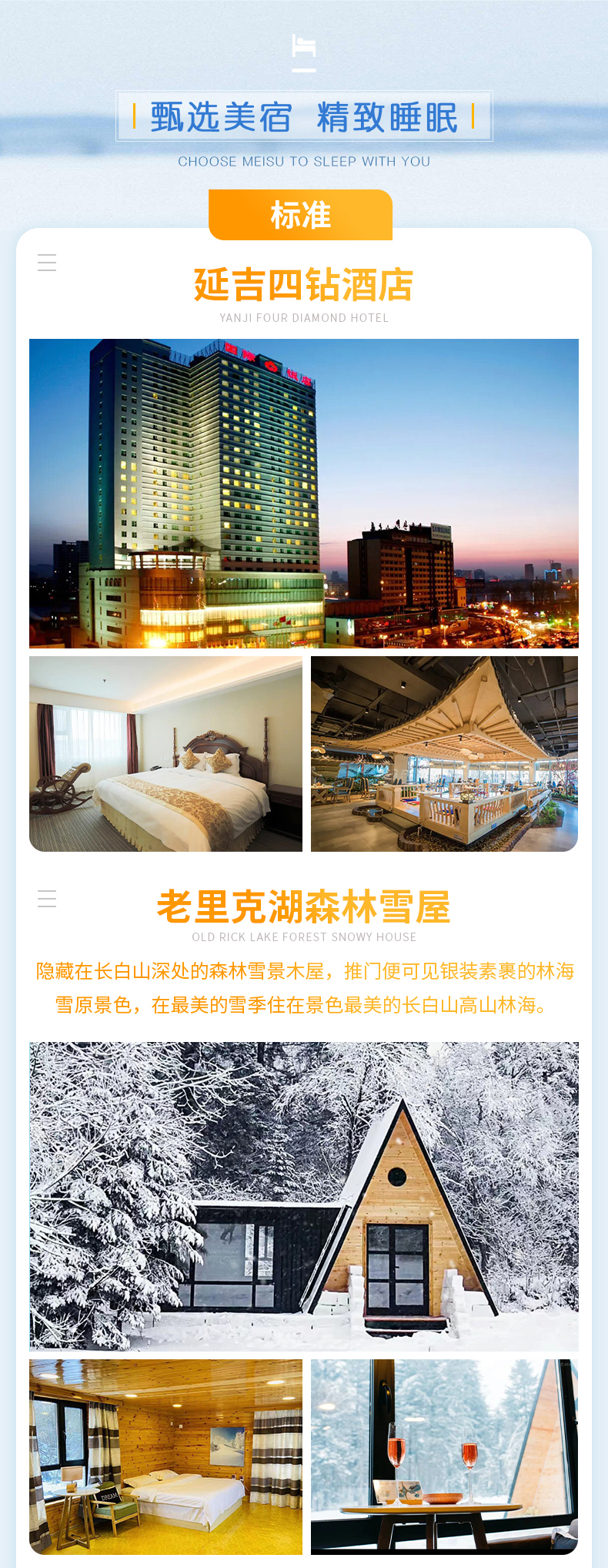 第四晚:望·长白鲁能美憬阁精选酒店或同等级(如望.长白美憬阁满房,置换鲁能度假区瑞士酒店,退房间差价)