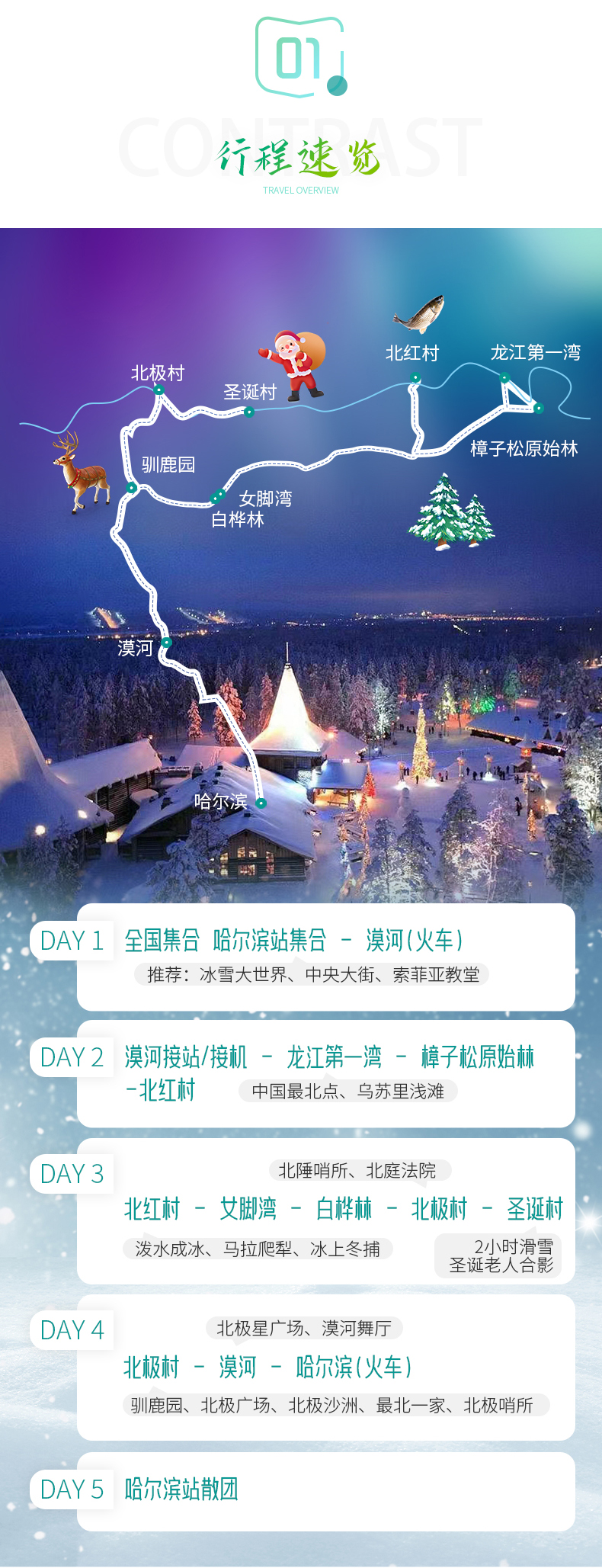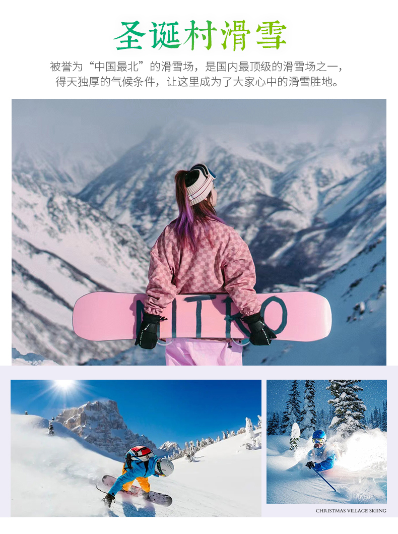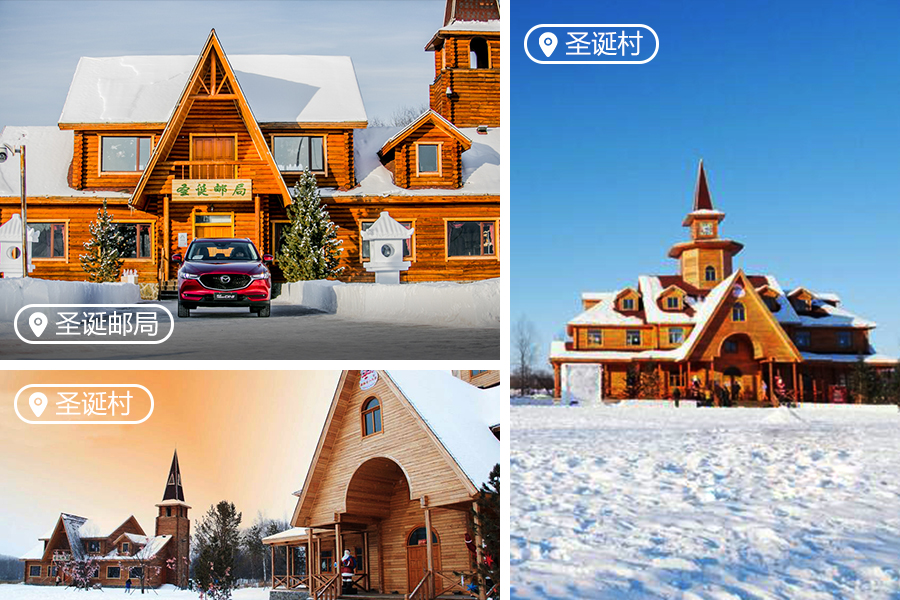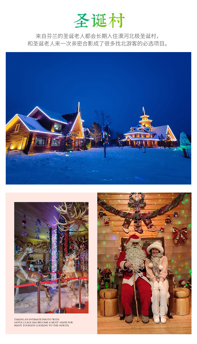 北红村(泼水成冰、马拉爬犁、冰上冬捕)-女脚湾-白桦林-北极村(北庭法院、北陲哨所)-圣诞村(2小时滑雪、圣诞老人合影)