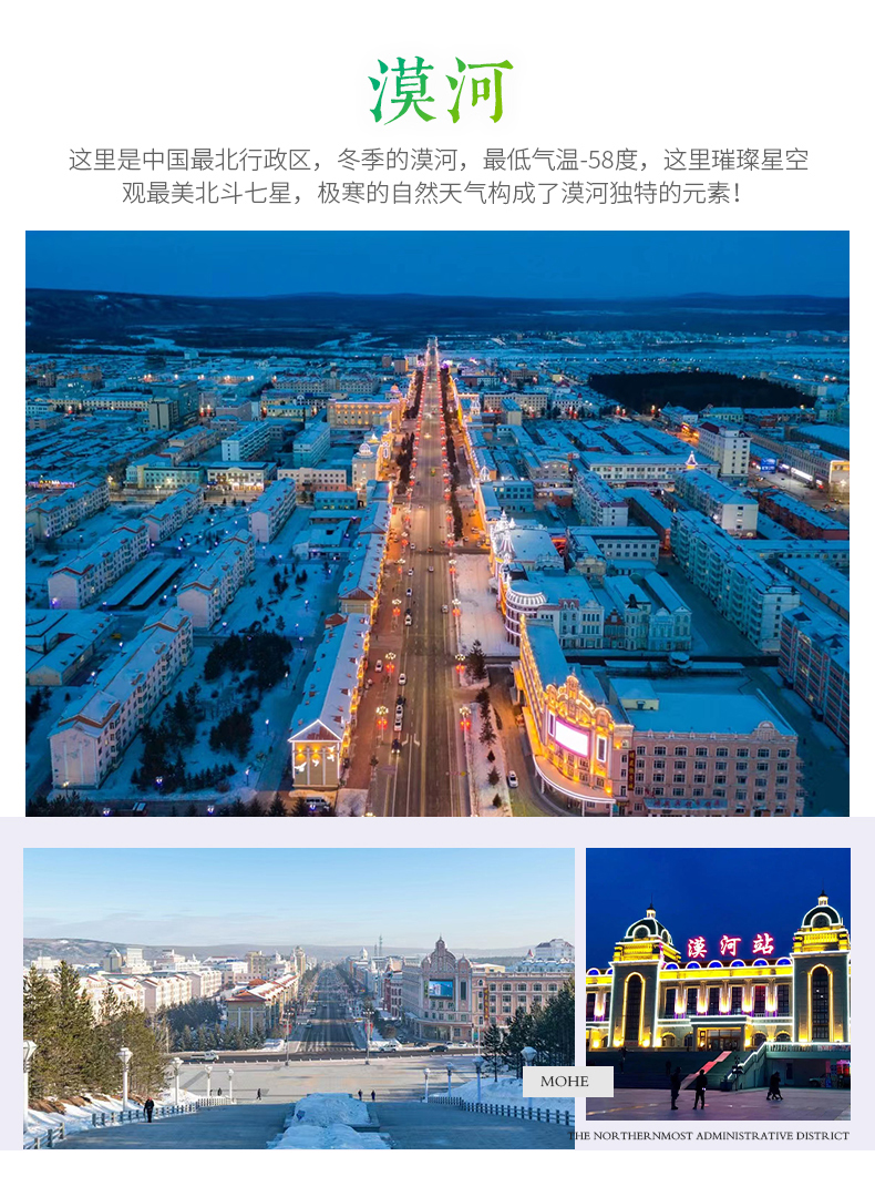 √ 车程10:30-12:00,【漠河】,漠河西与内蒙古自治区额尔古纳市为邻,南与内蒙古自治区根河市和呼中区交界,东与塔河县接壤,北隔黑龙江与俄罗斯外贝加尔边疆区和阿穆尔州相望。