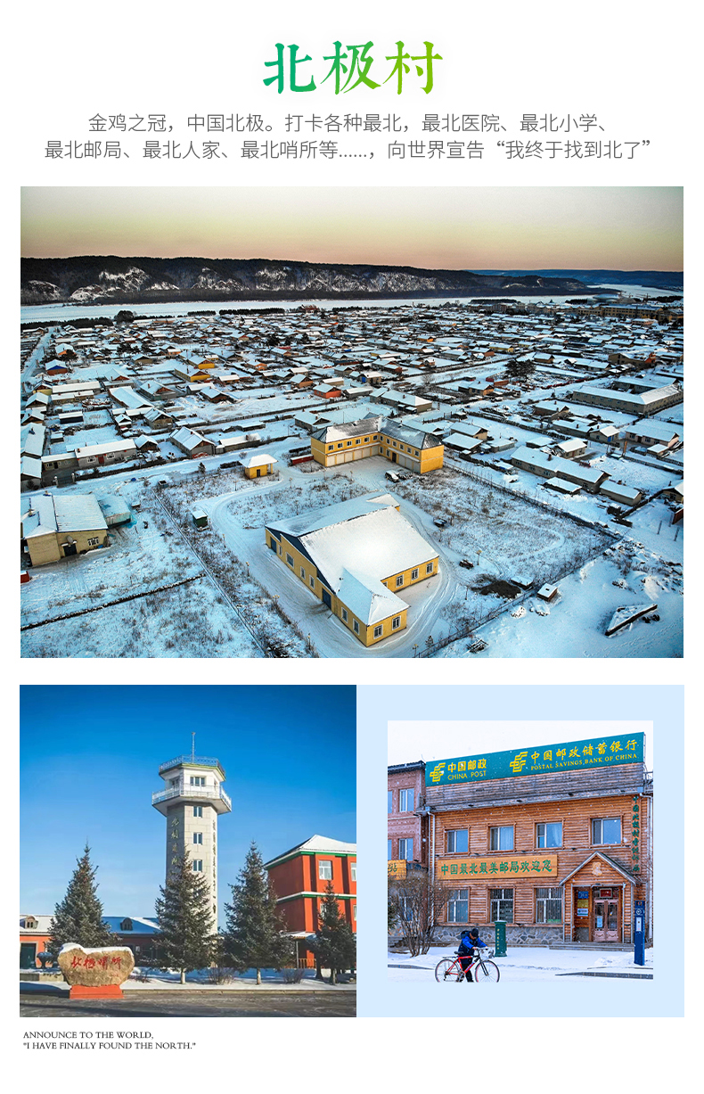 √ 车程11:30-12:00,祖国最北端,有着金鸡之冠、神州北极之称的【北极村旅游风景区】,这里是漠河市的北极镇所在地,人口2806人,面积16平方公里。地理坐标在北纬53’33’,中国纬度最高处。黑龙江从北面蜿蜒流过,对岸便是俄罗斯阿穆尔州。