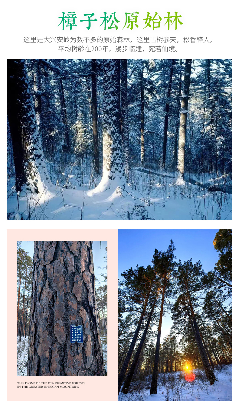 √ 游览15:30-16:00,「樟子松原始林」这里的樟子松树参天林立,松香醉人,占地面积22公顷,林龄约150年,林中樟子松平均胸径36厘米,长势良好的树木需要两个人才可以环抱。
