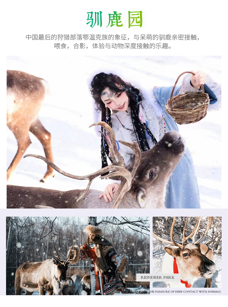 √ 游览08:00-10:30,「北极广场」、「北极沙洲」与「最北一家」,我们还要到「最北邮局」来到此处买纪念品和明信片,写上祝福的话语,再让工作人员盖上最北邮局的戳,从中国最北的地方寄回家,给自己的旅途添上一抹独特的意义吧。中国北方游牧民族历史文化的活化石。【驯鹿园】在这里可以与驯鹿亲密接触,快将新鲜的苔藓分发给童话精灵吧。