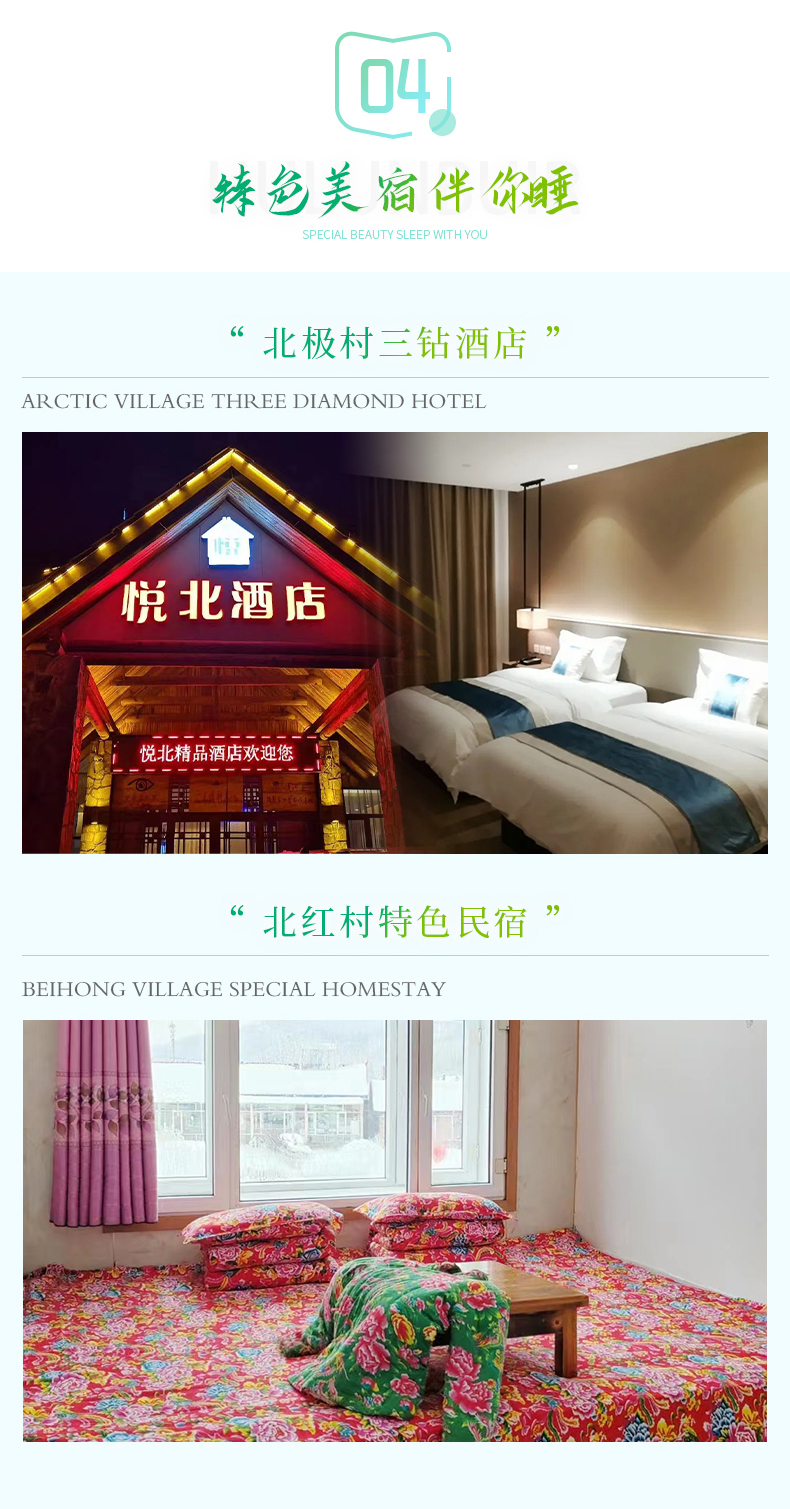 【住 宿】:第一晚:哈尔滨-漠河火车卧铺;第二晚:北红村民宿炕2人间(自备洗漱用品);第三晚:北极村悦北酒店或同级酒店;第四晚:漠河-哈尔滨火车卧铺