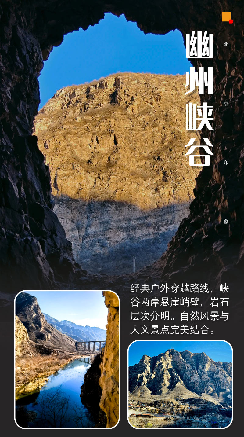 户外徒步线路(非休闲):幽州峡谷徒步,全程约14-19公里(因大巴车交通问题,根据人数确定是否折返/全程穿越),全程基本本无爬升,途中经过几个挂壁山洞,一边是悬崖一边是永定河峡谷,山水人文兼顾,风景秀丽。户外强度0.8为休闲徒步级别,适合有一定户外经验的人群参加(18-55周岁),正常体力约徒步约6小时。