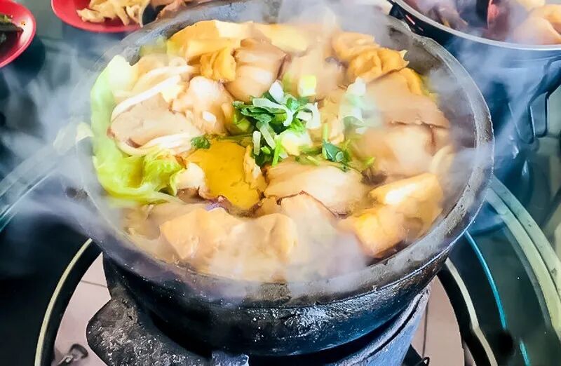 制作时以一主锅为主,放入五花熏肉、白菜、鲜豆腐、冻豆腐、炸豆腐等。