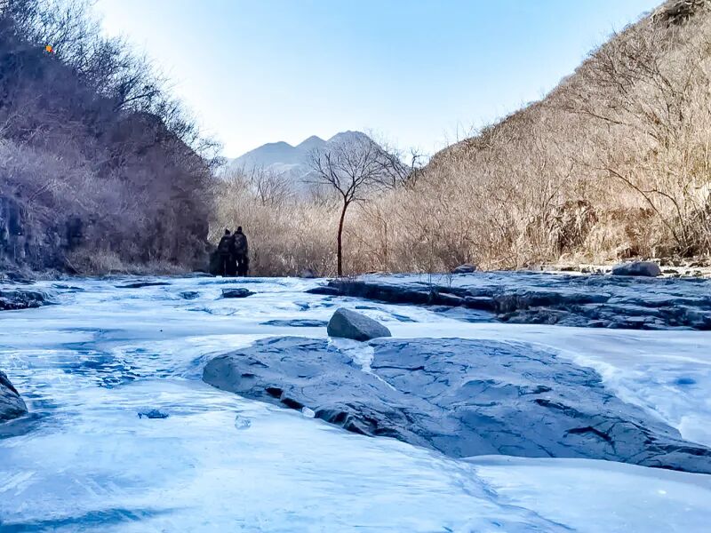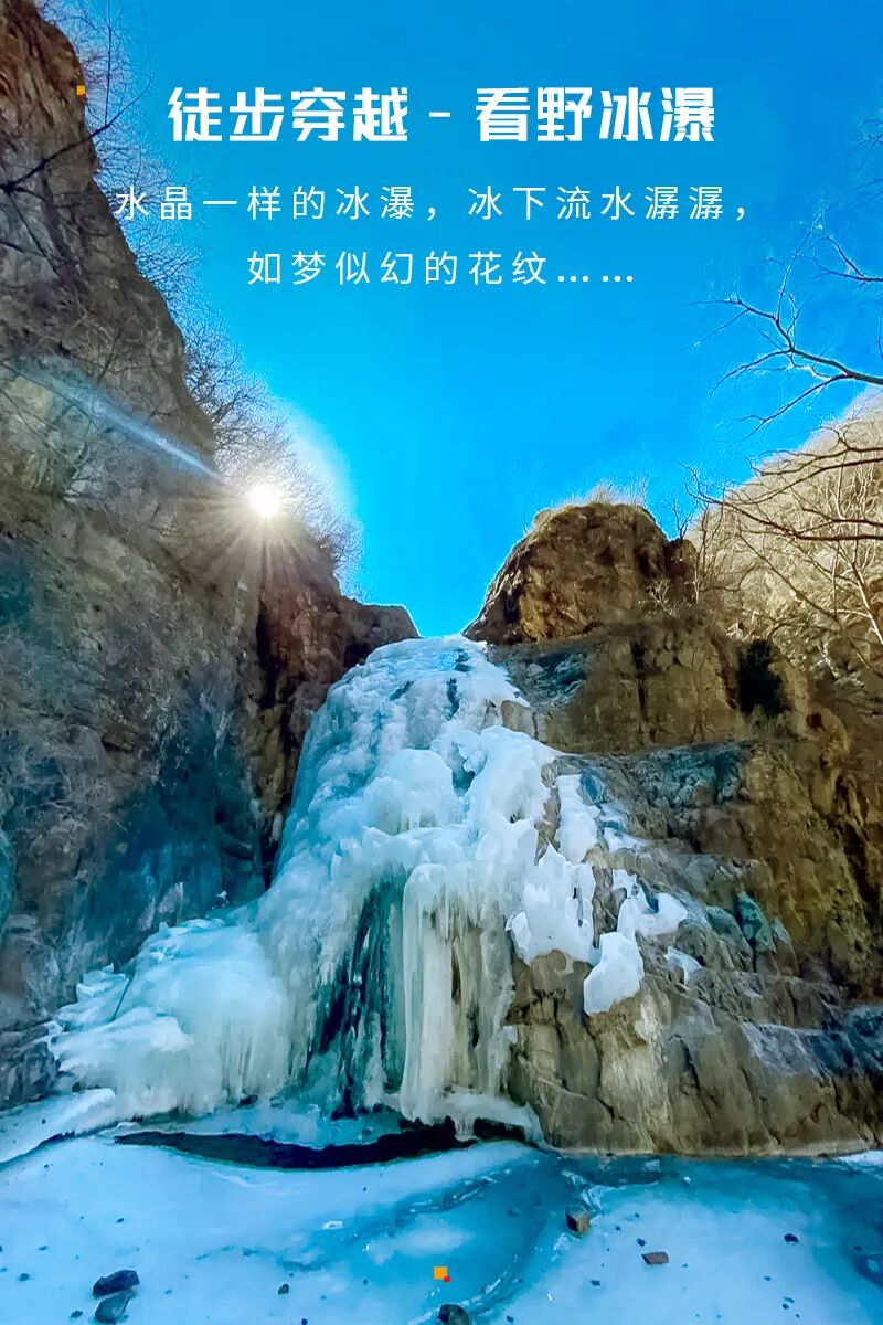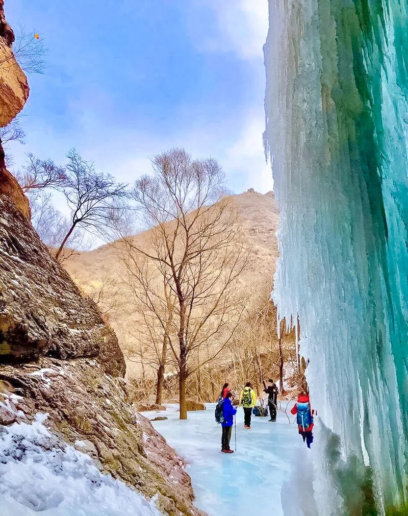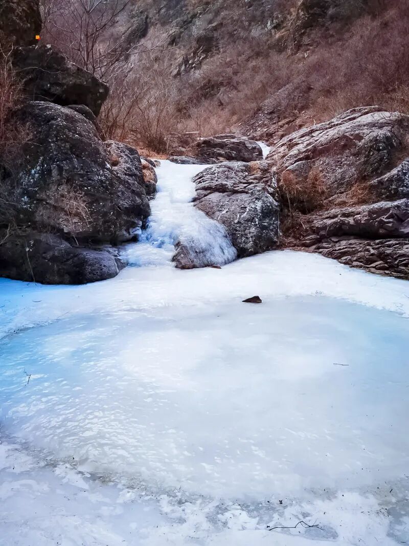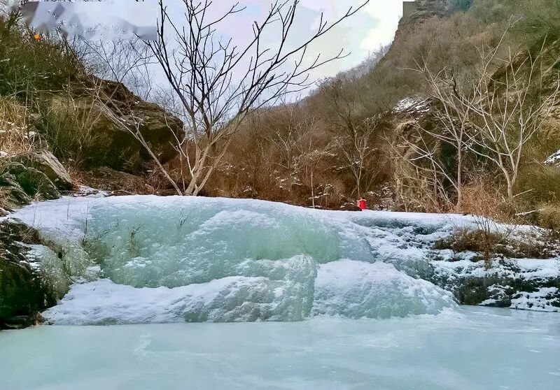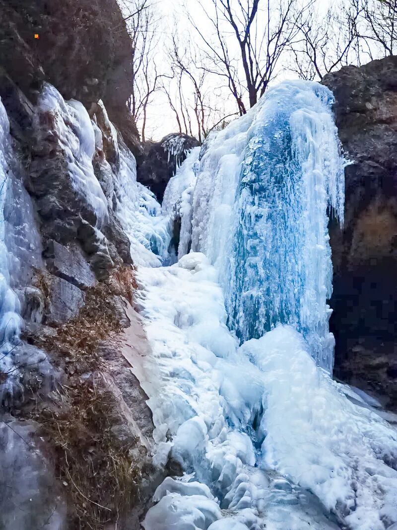 往日流水潺潺的河溪,凝结成洁白的“玉带”在山涧舞动。悬挂在崖壁之上,山谷之下,一派琼妆玉砌,凝固成冰瀑,冰床,冰梯,冰花,冰凌,闪着银光,似乎把人带进了瑶池仙境。这酷似晶莹剔透的童话世界,是老天赐给我们的冬日最美好的礼物。