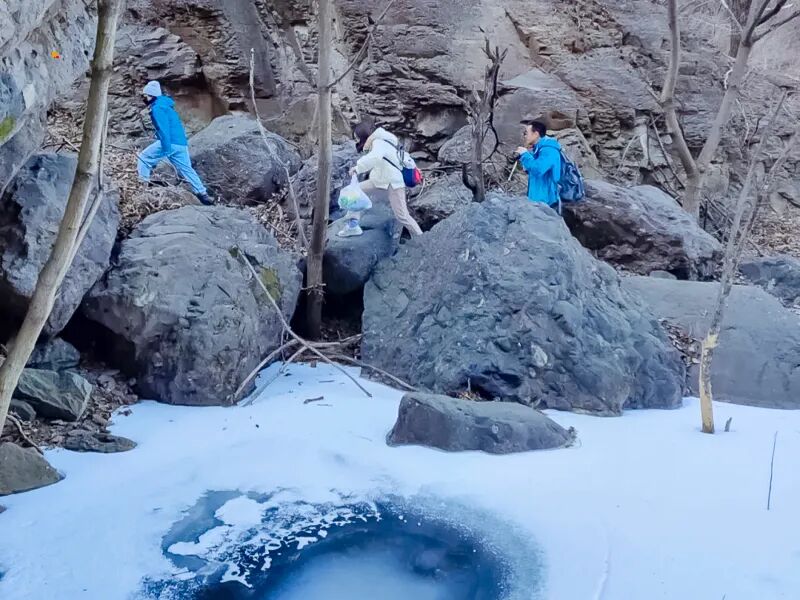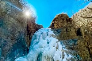 山谷深处,一道高10米、宽5米的冰面飘于崖边,像壮美的瀑布一样,冰瀑右下边的冰面已经被“撕破”,露出后面的凹型空洞,宛若花果山上的水帘洞。洞口的冰瀑珠帘玉垂如在开半帘的厚重帏幕帘,让洞里充满神秘感。近距离接触冰瀑,由上而下的流水冻结了各种姿态的冰瀑,非常震撼,两边黝黑的岩石衬托着冰瀑更加洁白迷人。