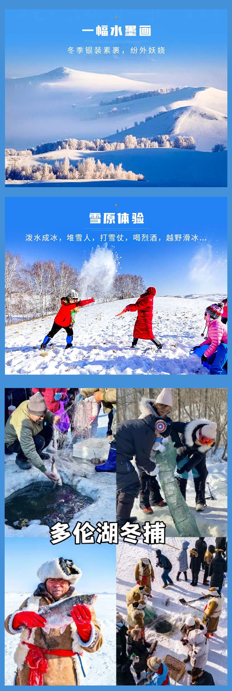 多伦湖冬捕:这是北方独有的捕鱼方式,在厚厚的冰面凿出窟窿,用渔网下入水里进行捕鱼,这里虽然没有查干湖那样壮观的大规模捕鱼表演,但是可以看到当地渔民日常的捕鱼工作。可以亲自参与其中,凿冰、下网、拉网,亲身体验冬捕的乐趣!【冰趣乐园】:冰上迷宫、冰上龙舟、冰上自行车、龄球、卡通玩具服、水晶球、陀螺、雪地足球等供大家游玩。