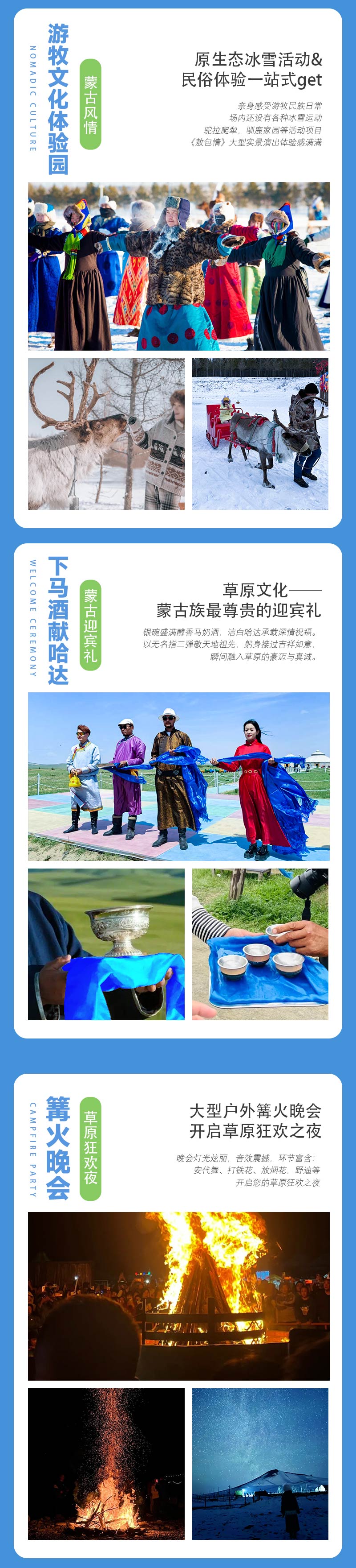 3)用餐:共含五餐(D1迎宾下马酒晚宴、D2早餐、D2中餐雪地铁锅炖、D2晚餐特色蒙餐、D3早餐);