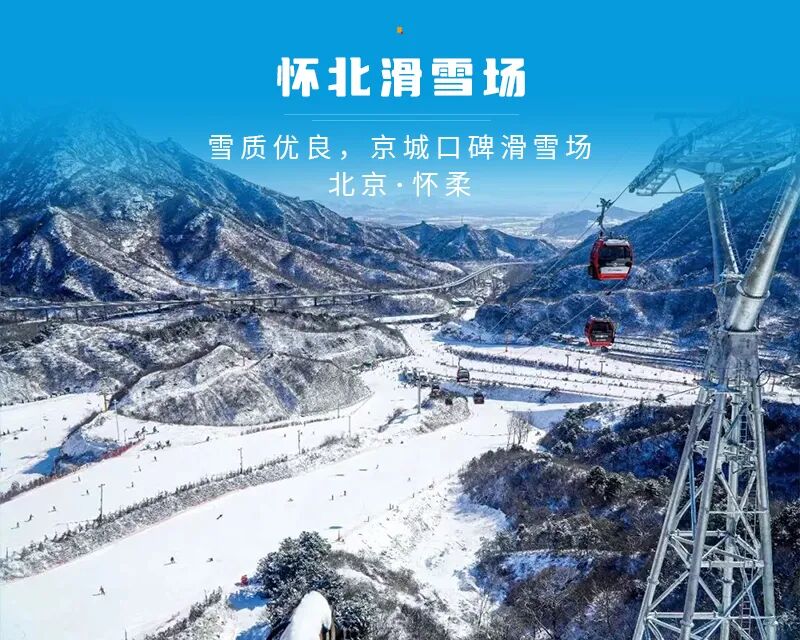 怀北国际滑雪场位于北京市怀柔区怀北镇河防口村,景色秀美,四季经营,由1条高级道7条中级道和3条初级道、1座戏雪乐园组成,拥有北京非常丰富的中高级雪道区,雪道落差大,是集人文景观和自然景观于一体的滑雪场,素有长城怀抱中滑雪的美誉。除了滑动,还可以在这里漂流(有落差高达189米的峡谷密林极限漂流,全长3.86公里)。