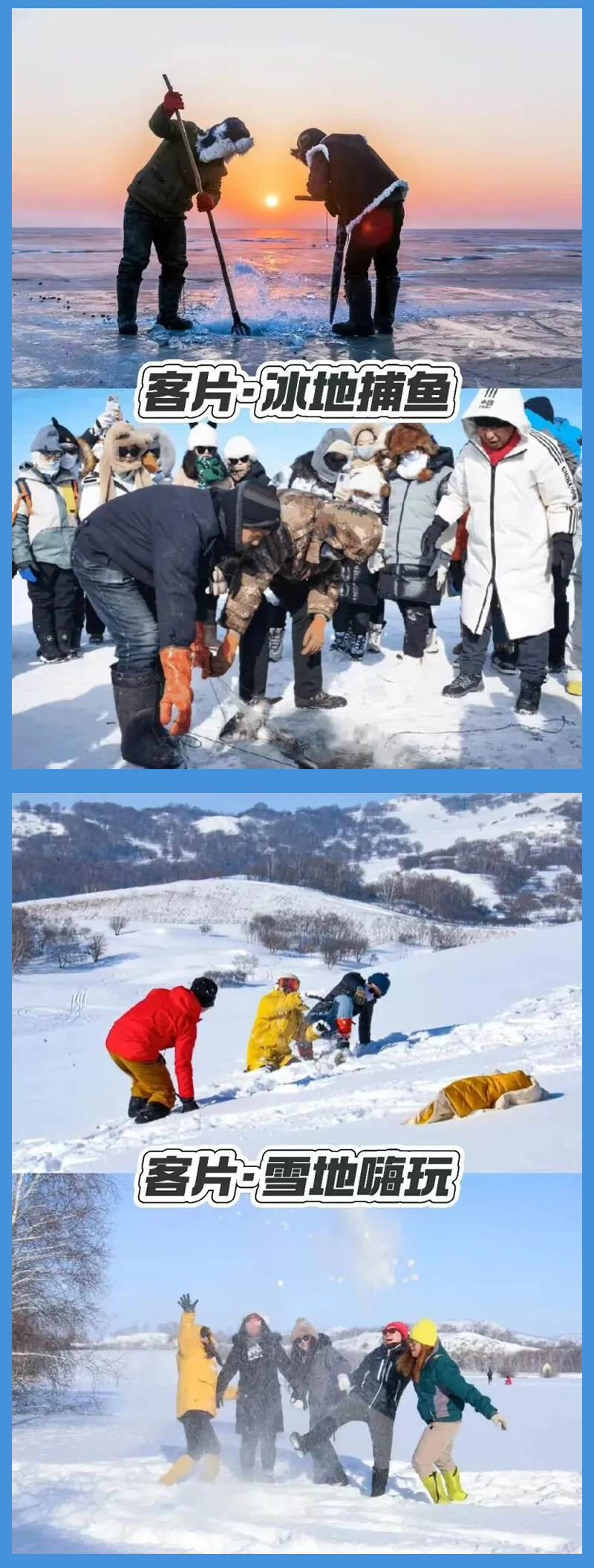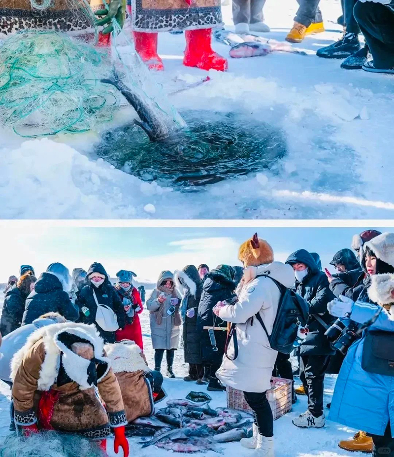 『多伦湖·冬捕盛会』古老神秘的渔猎活动,热闹的气氛唤醒了这座沉睡在冬日里的湖泊。踏着雪海冰封,一起来感受不一样的冬捕魅力吧!这是北方独有的捕鱼方式,在厚厚的冰面凿出窟窿,用渔网下入水里进行捕鱼,这里虽然没有查干湖那样壮观的大规模捕鱼表演,但是可以看到当地渔民日常的捕鱼工作。可以参与其中,凿冰、下网、拉网,亲身体验冬捕的乐趣!随后在湖面体验冰雪娱乐滑冰车、坐龙舟、滑雪圈、抽冰嘎...