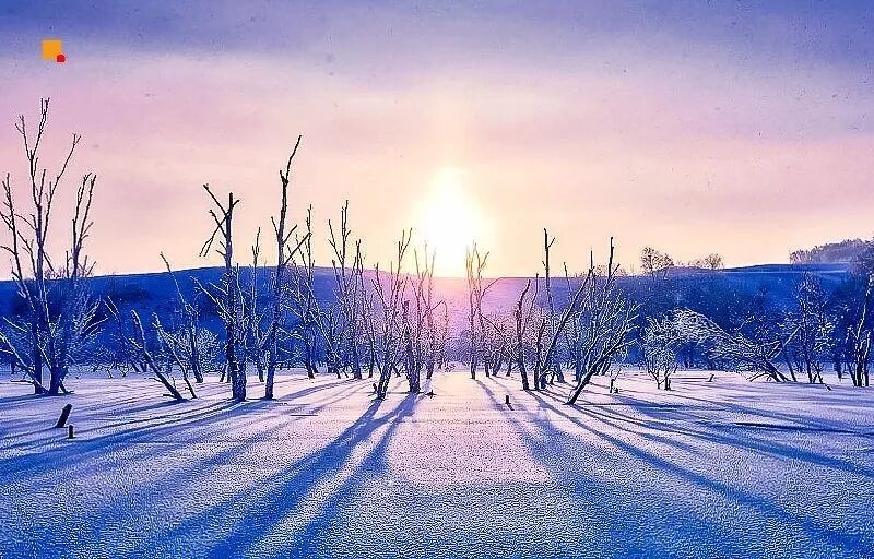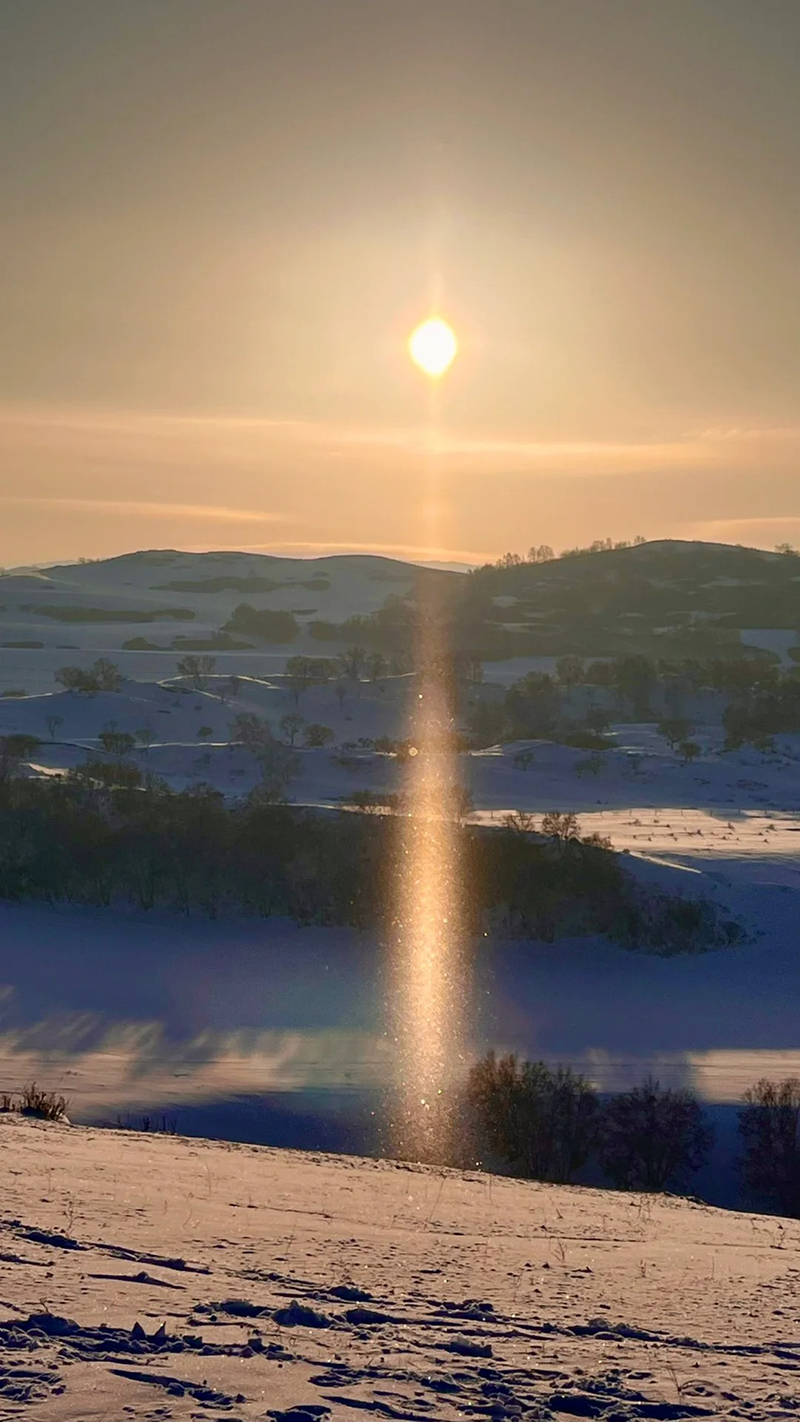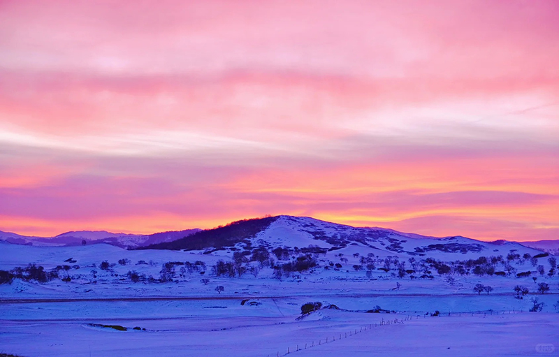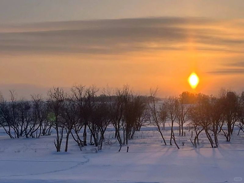 日落是不容错过的浪漫。当夕阳为雪地镀上一层金红,远处的山峦与近处的树影交织成画,天地间只剩纯粹的色彩与静谧,此刻的光影变幻,是大自然最慷慨的馈赠。而暖水河的 “魔界日出” 更显奇幻,晨雾在冰封的河面上流转,玉树琼枝间透着微光,仿佛闯入了童话里的冰雪王国,随手一拍都是定格时光的大片。