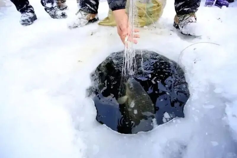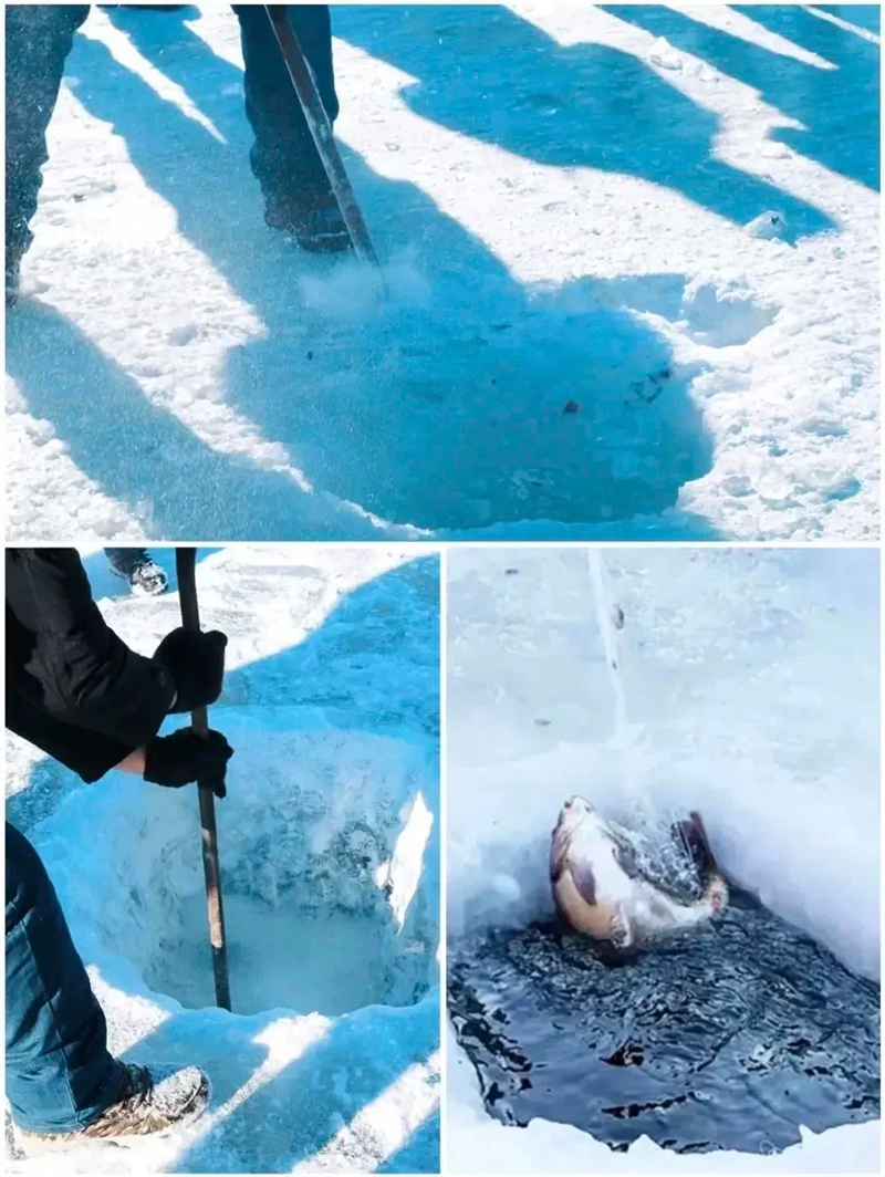 渔民们打眼、破冰、下网,水下走杆,一招一式按照传统步骤逐一还原冬捕过程。从破冰下网到满怀期待地收网,当活蹦乱跳的大鱼被冰面瞬间冻住,那份来自冰层之下的鲜活生命力量,仿佛将整个冬天的寒冷都融化为收获的温暖。
