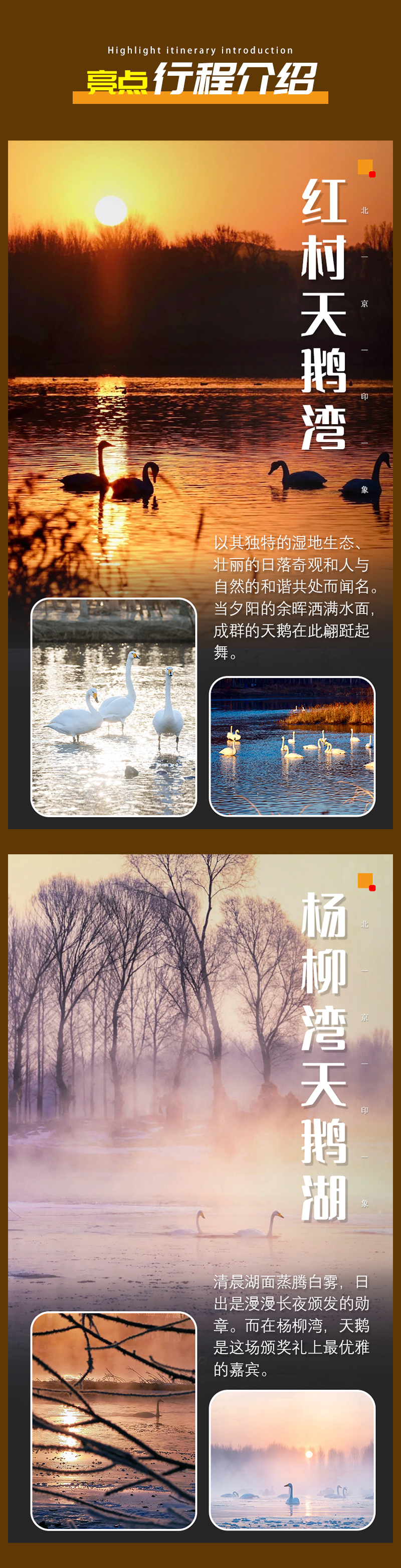 - 早起集合前往『杨柳湾天鹅湖』,这里的日出、天鹅、晨雾非常出片,运气好的话还能欣赏到这里绝美的雾凇美景!