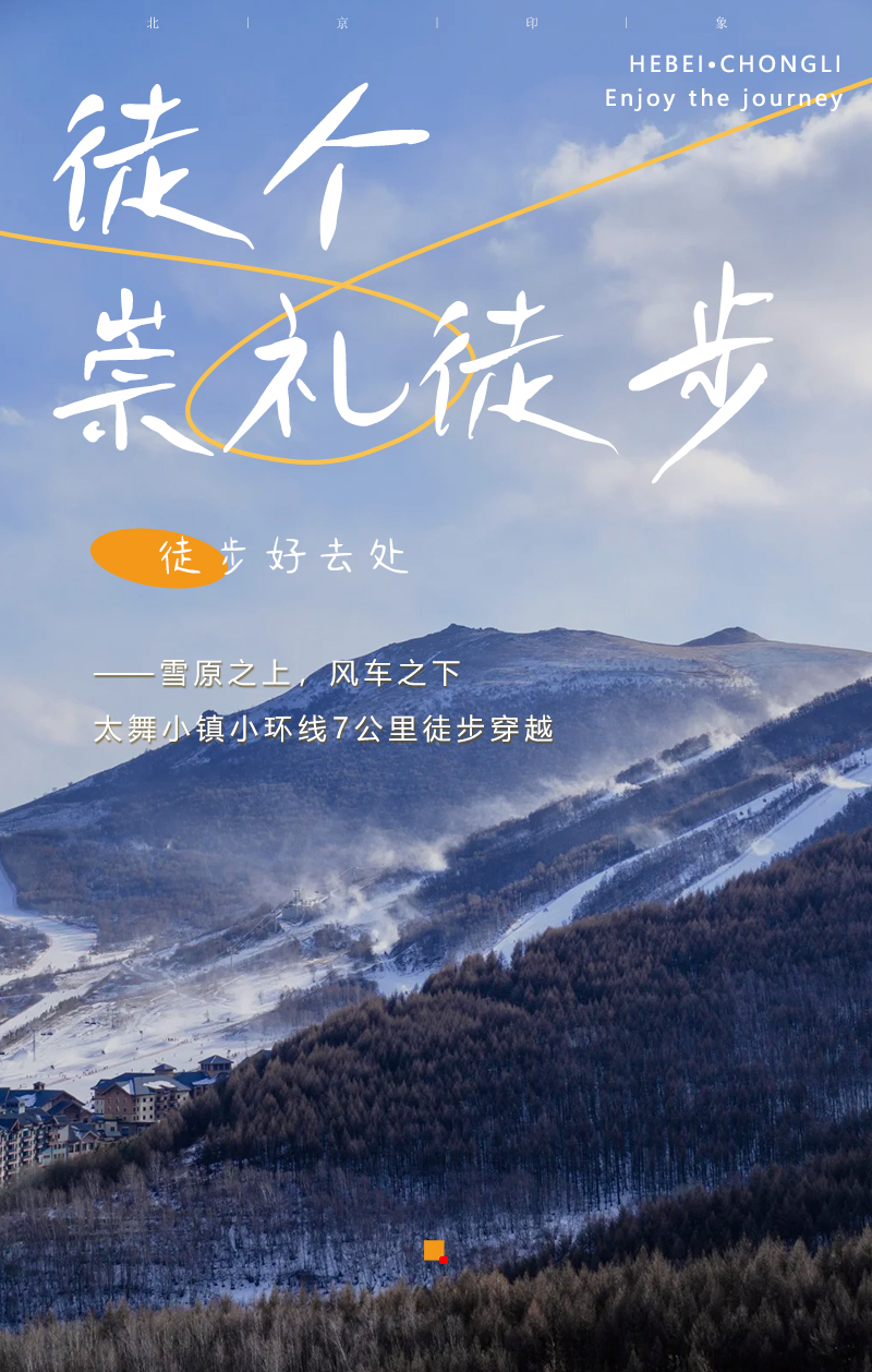 我们可以看到88座白色风力发电机组成的“风车森林”,巨型叶片切割寒风发出低沉鸣响,雪地上投射着流动的几何光影。可俯瞰明长城烽火台在雪原中蜿蜒的黑色剪影。途中经过复刻意大利帕罗尼诺风格的欧洲小镇,冬季的太舞小镇,远不止是滑雪胜地。用徒步的方式深入其中,你将以一种更缓慢、更深刻的节奏,听见雪落下的声音,触摸山脉冬季的脉搏,找到属于山野的宁静与澎湃。