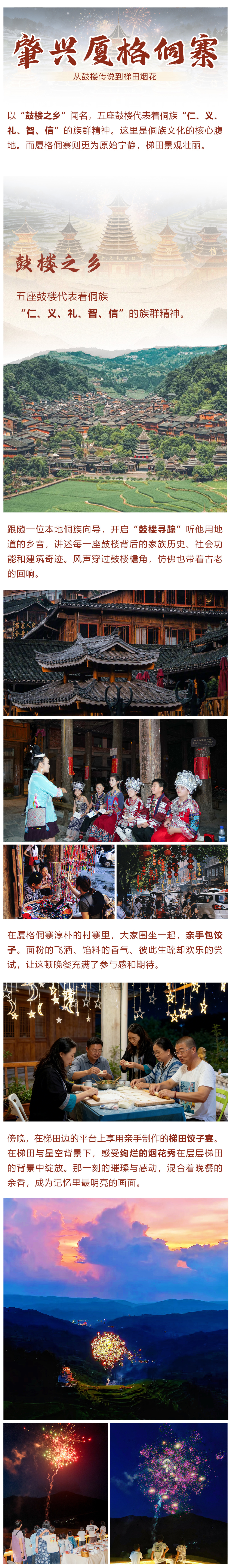探访原始淳朴的厦格侗寨,侗寨里保留着更原始的侗族风貌,无过度商业化,农耕生活与古村落格局原汁原味。在这里,我们一起亲手包饺子,欣赏绚烂烟花秀。