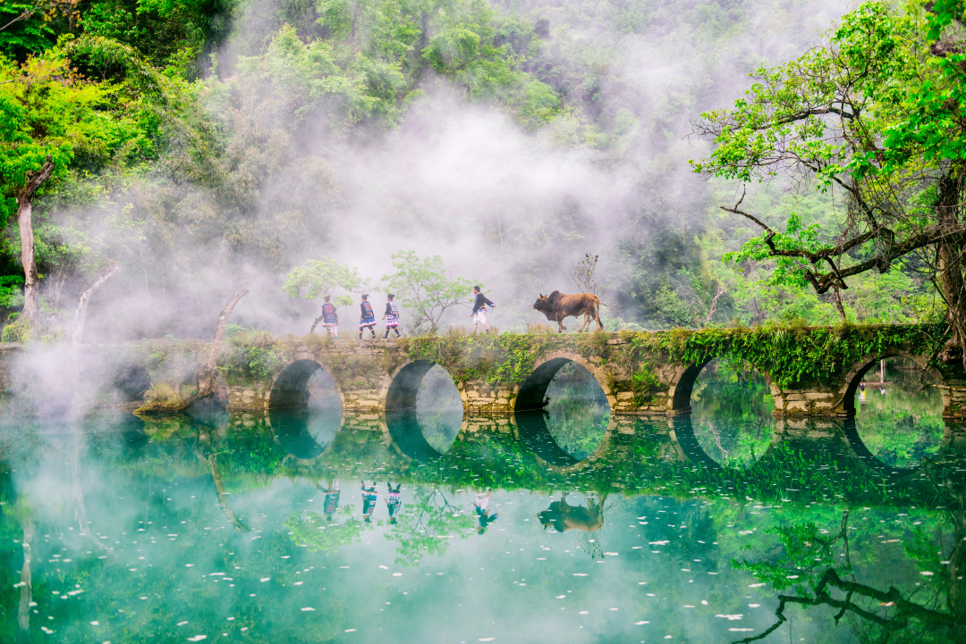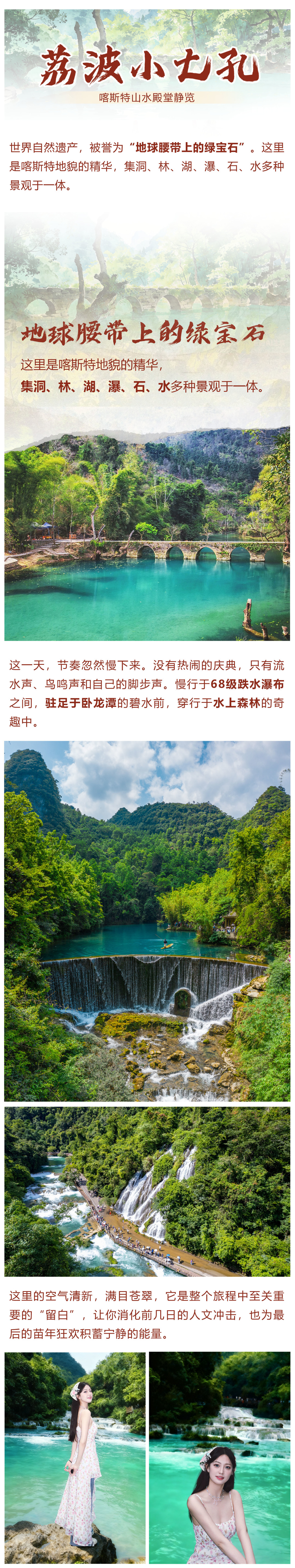 早餐后告别侗寨,乘车前往荔波小七孔(约3小时车程),荔波小七孔被誉为“地球腰带上的绿宝石”。冬日的小七孔少了喧嚣,多了静谧,小七孔古桥静静的横跨在响水河上,68级跌水瀑布上,蓝绿色湖水与岸边红叶相映成趣,宛如仙境。