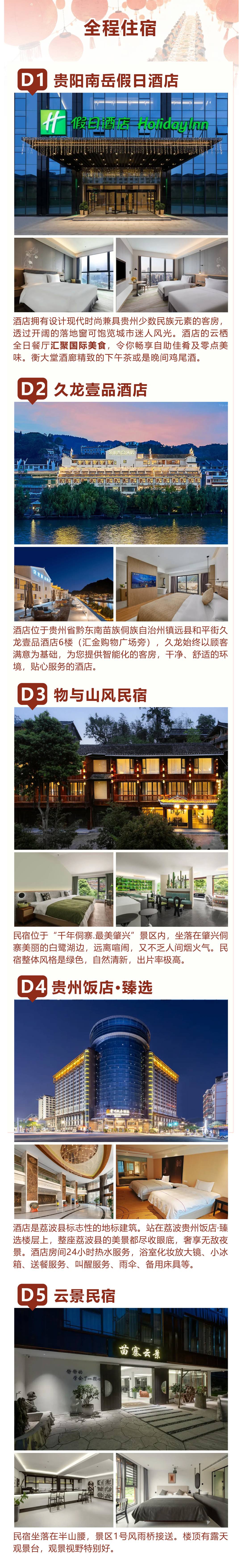 【住宿】1晚南岳假日酒店或同级、1晚镇远久龙壹品或同级,1晚西江云景民宿或同级,1晚肇兴物与山风酒店或同级,1晚贵州饭店·臻选(荔波古镇店)或同级;