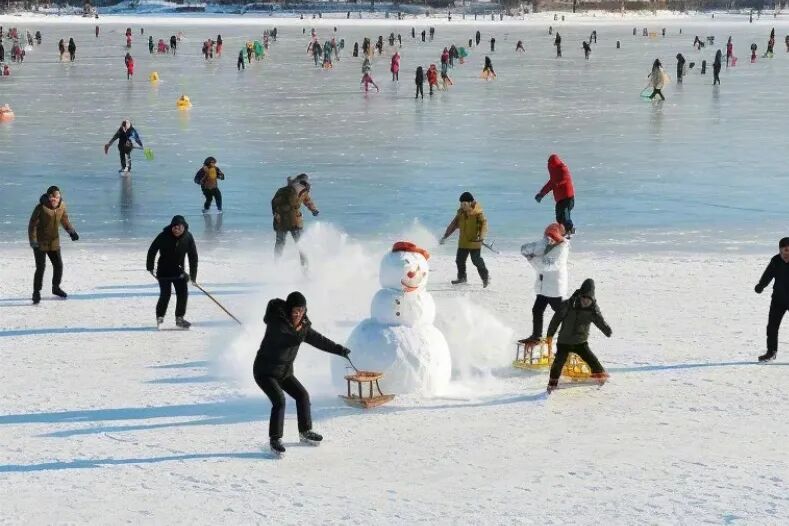 湖面结成了冰场,积雪厚度能达到膝盖以上,