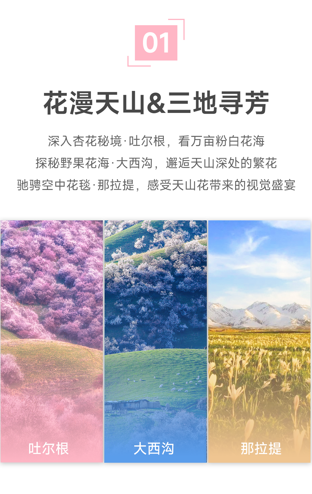 【花期说明】伊犁杏花一般在清明前后开放,受气温及天气变化影响较大,每年花期不固定,无法确保每年最佳花期,不同海拔高度不同地方花开时间都不一样,我司会根据花开情况,灵活调整拍摄行程,最大限度进行摄影创作,花期短暂,请平常心看待,届时请配合领队工作,敬请谅解!