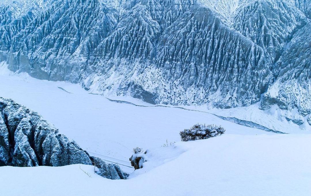 早上用完早餐后,前往独山子大峡谷,拥有“独库秘境,亿年奇观”之称的独山子大峡谷位于独山子区境内,水冲出天山后,切割独山子西南方向倾斜平原形成的神奇风光峡谷,峡谷两岸的阶地很是壮观,天山雪水及雨水流下来经过这里的土壤形成的冲积沟壑,在谷壁雕凿出这些奇特景观。,3,4月份的独山子大地,放眼望去一派银装素裹,站立在高处远山雪域尽收眼底。峡谷地貌纵横交错,黑白双煞,似人工雕塑,似上苍穹变。雪,只有雪才能让峡谷变迁万像,美轮美奂,从200米的高空俯瞰雪域峡谷万物有灵,给人以不一样的视觉盛宴。