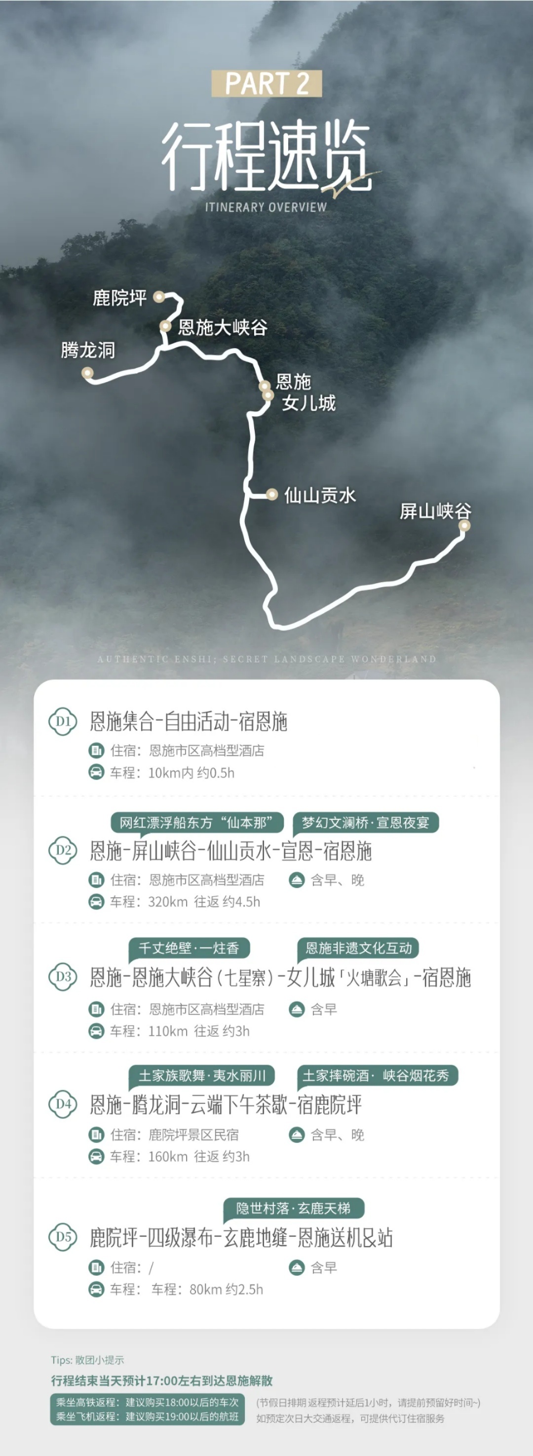 - 下午我们将乘车返回恩施,司导会把队员送到恩施许家坪机场或恩施站。至此,本期的恩施之旅告一段落,大家可以带着一路的美好记忆,奔赴家中的烟火与安宁。