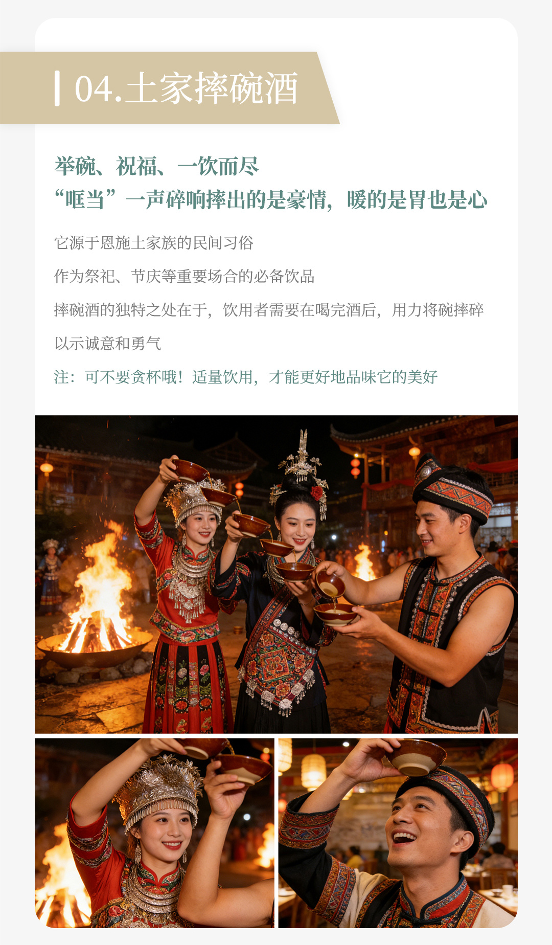 - 这一习俗源自恩施土家族古老传统,是祭祀祈福、节庆宴饮等重要场合的待客礼俗。酒尽碗碎,以清脆声响昭显诚意,以洒脱姿态传递勇气,藏着土家人淳朴热烈的处世之道。