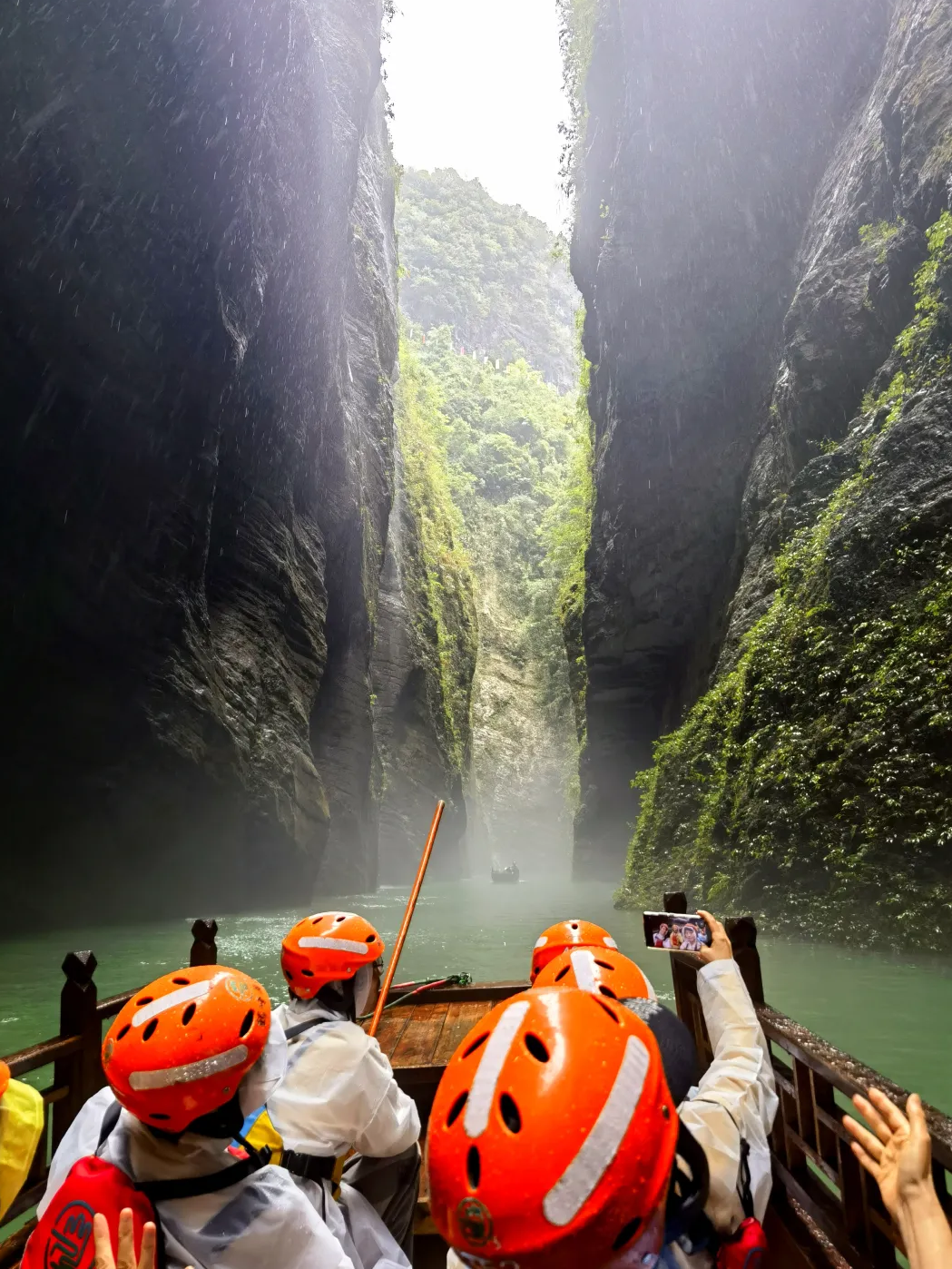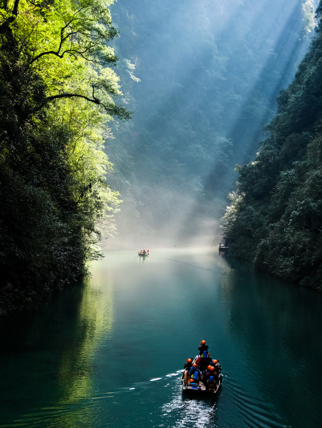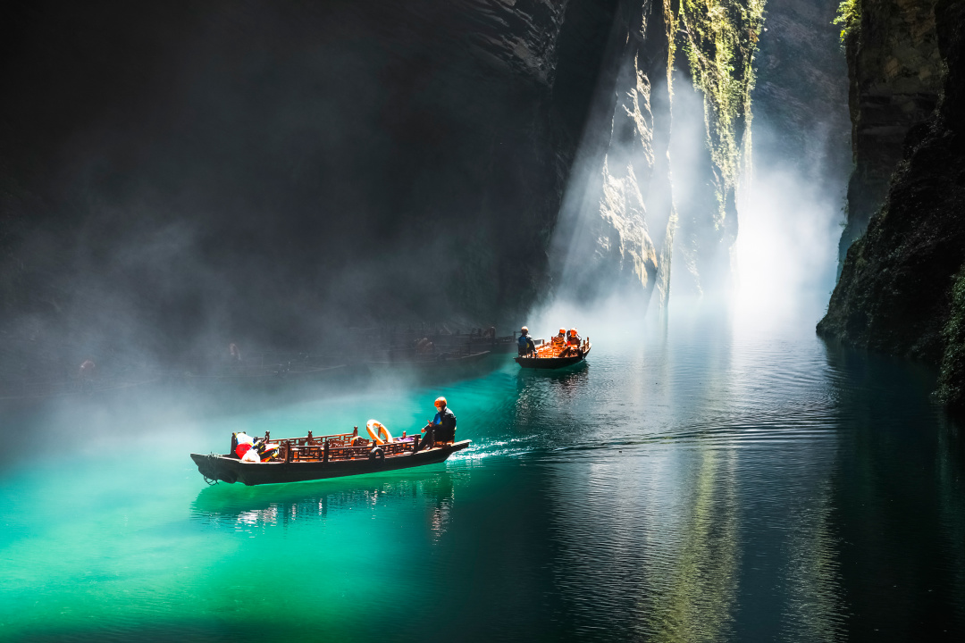 - 晴日里,阳光折射水面,泛舟其上如凌空悬浮,仙气飘飘;雨天时,谷内温差催生薄雾,云雾缭绕间,宛若闯入缥缈仙境。