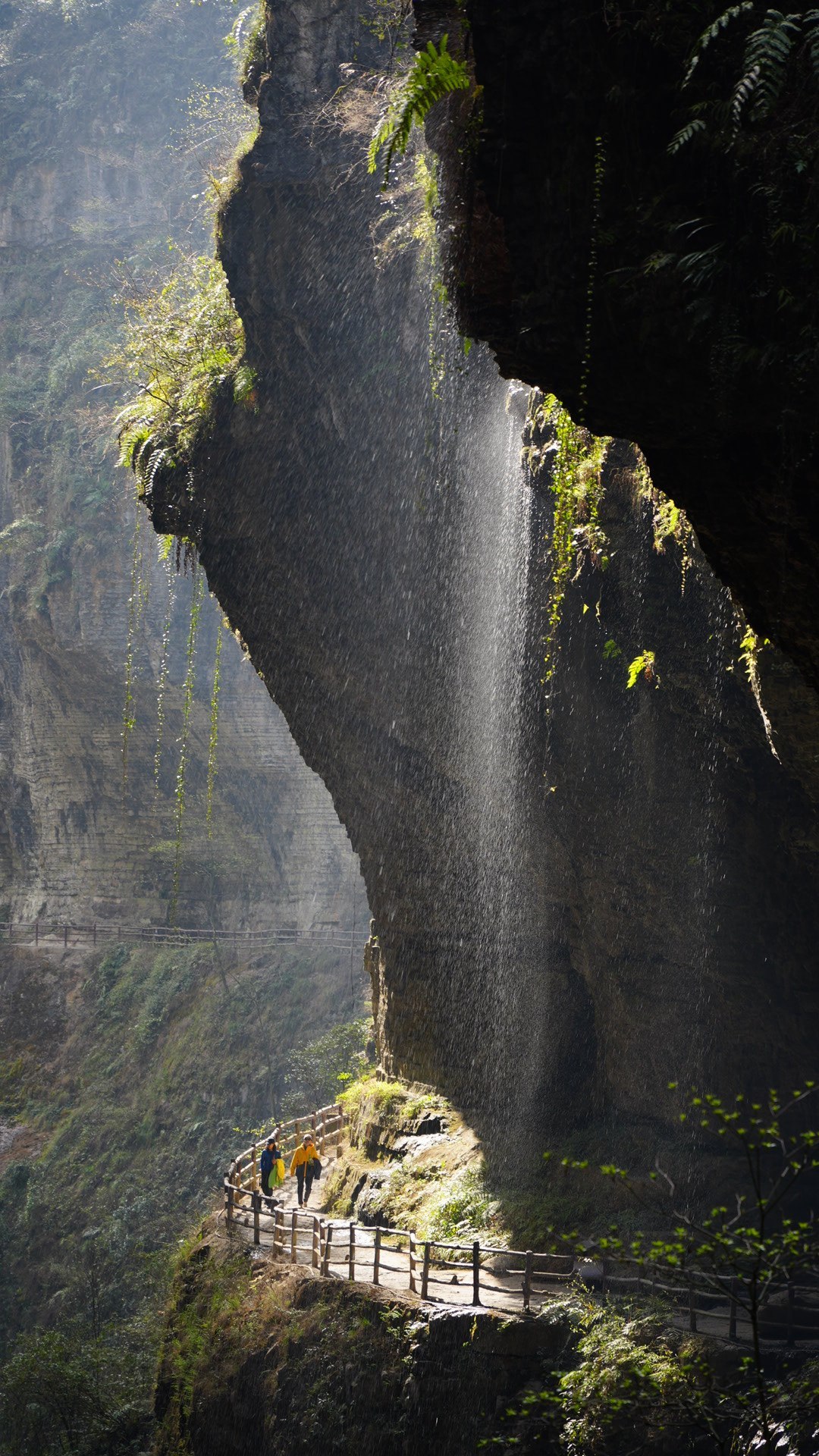 - 远处的玄鹿地缝,丝丝瀑布如银练垂落悬崖,轰鸣声震耳欲聋,气势磅礴撼人心魄。站在瀑下,扑面而来的水汽氤氲周身,尽情拥抱这份大自然的慷慨馈赠。