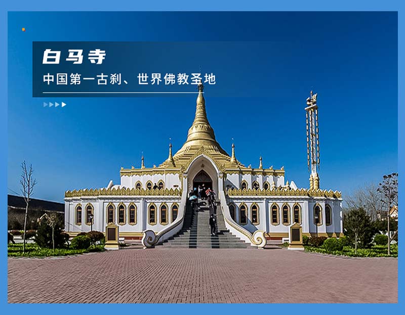 - 早上前往洛阳白马寺参观。白马寺创建于东汉永平十一年,中国第一古刹,世界著名伽蓝,是佛教传入中国后兴建的官办寺院,有中国佛教的“祖庭”和“释源”之称,距今已有1900多年的历史,现存的遗址古迹为元、明、清时所留。