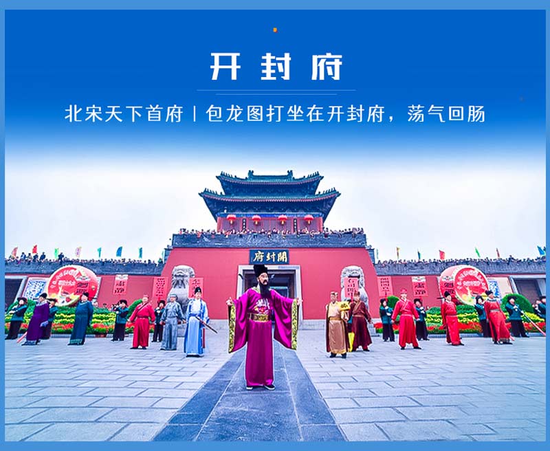 - 早餐后,我们前往开封府游览。欣赏《开衙迎宾》演出,之后欣赏《包公断案•包公怒铡陈世美》等节目。