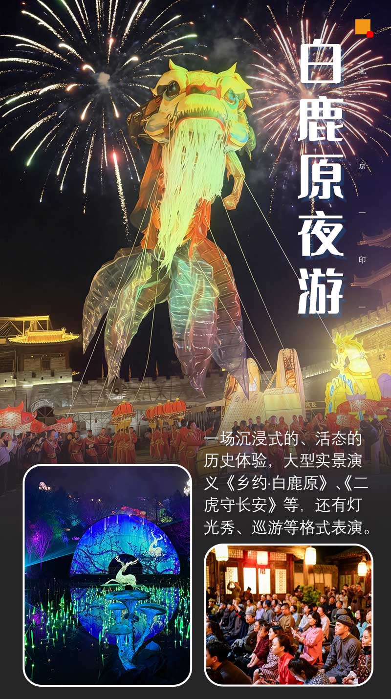 景区演艺项目其中包括大型特效特技实景剧《二虎守长安》、全球首创2½电影空间,集“拍、演、放”为一体的大型沉浸式互动演出《白鹿原·黑娃演义》、全国首家实景沉浸综合解密项目《密城·白鹿原》、大型儿童魔幻剧《魔法公主》、非遗文化展演《华阴老腔》,另外,根据小说改编的《衙门判案》《乡约立威》《白鹿仙子》《关中娶亲》等。