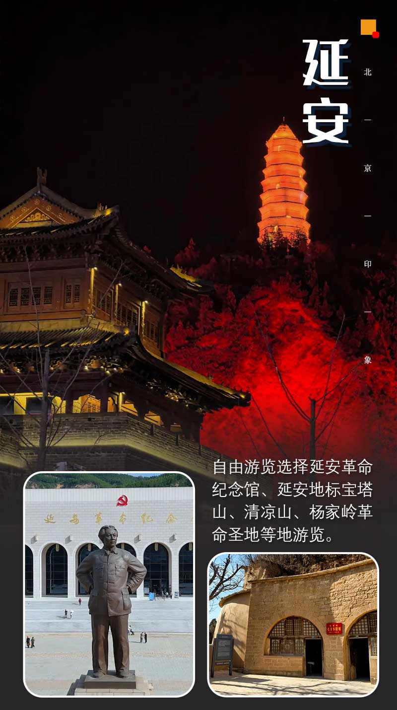 - 早上继续出发,下午抵达延安安排入住。大家根据时间自由游览选择延安革命纪念馆、延安地标宝塔山、清凉山、杨家岭革命圣地等地游览。