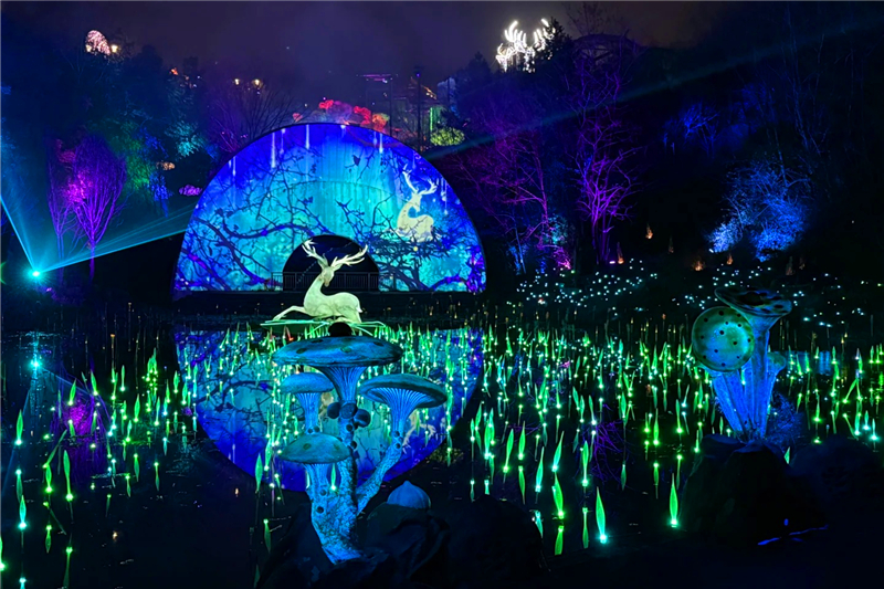 夜幕降临,在《夜谭·白鹿原》穿行,沉浸式感受光影、星空的魅力,万盏灯与鹿林仙境遥相呼应,30余组巨型灯组与夜空点点星光交相辉映,《魔咖·夜魔方》创意灯光秀以魔幻奇妙为创作灵感,“肉夹馍”“天使”“双面人”等元素惟妙惟肖,将充满怪诞色彩的魔方和空灵气质的白鹿融入其中,既实现了破圈传播,还彰显了白鹿原的文化底蕴,实现文旅融合的创新打开方式。