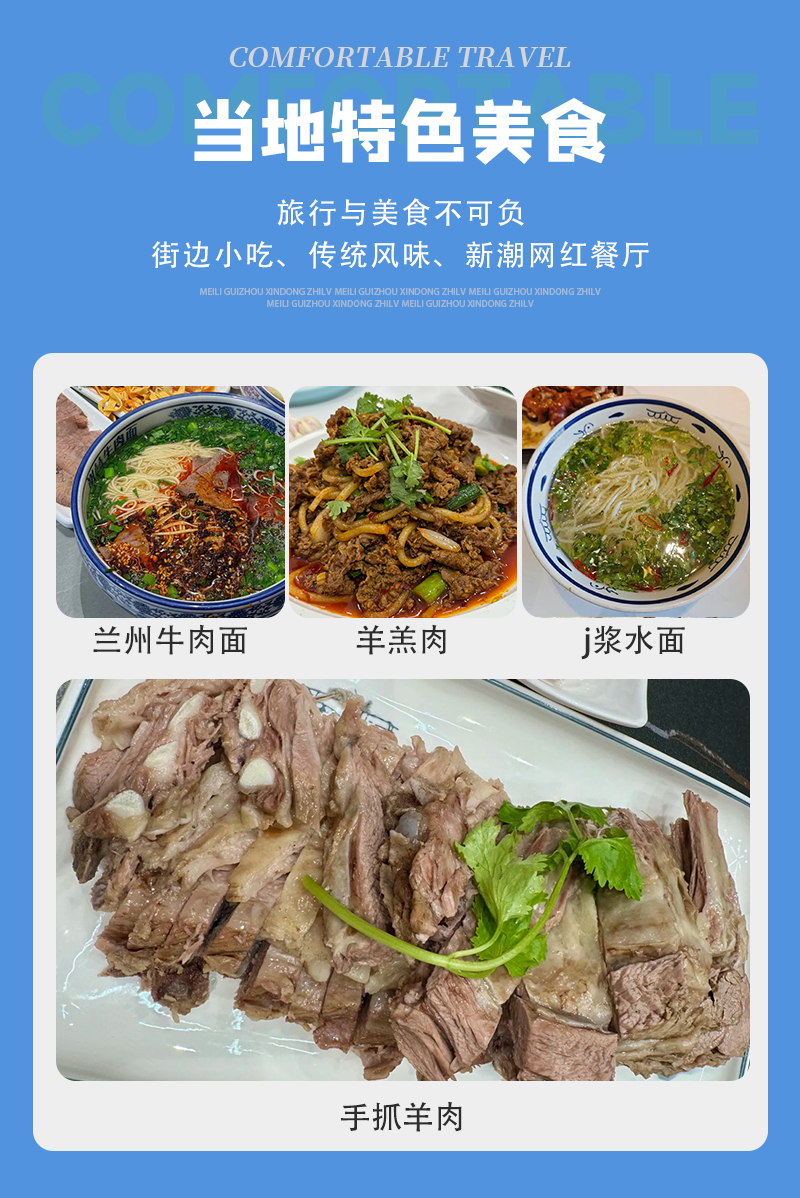 - 适时前往河西走廊的中心城市武威安排住宿,大家晚上自由结伴寻觅当地美食、欣赏夜景。推荐地:南城门楼、明清街夜市、钟楼、北关市场等……