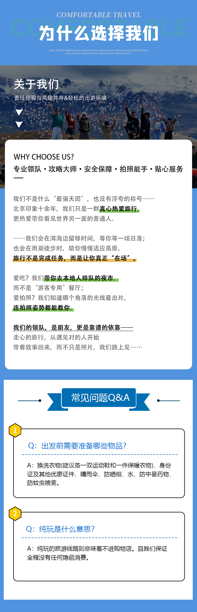 *本活动属于半自助游户外活动,领队安排行程不含景区内导游讲解,费用包含以外的自主费用自理;本团为纯玩团,全程不进购物店,没有任何形式购物环节,行程中也不留购物时间,敬请谅解。