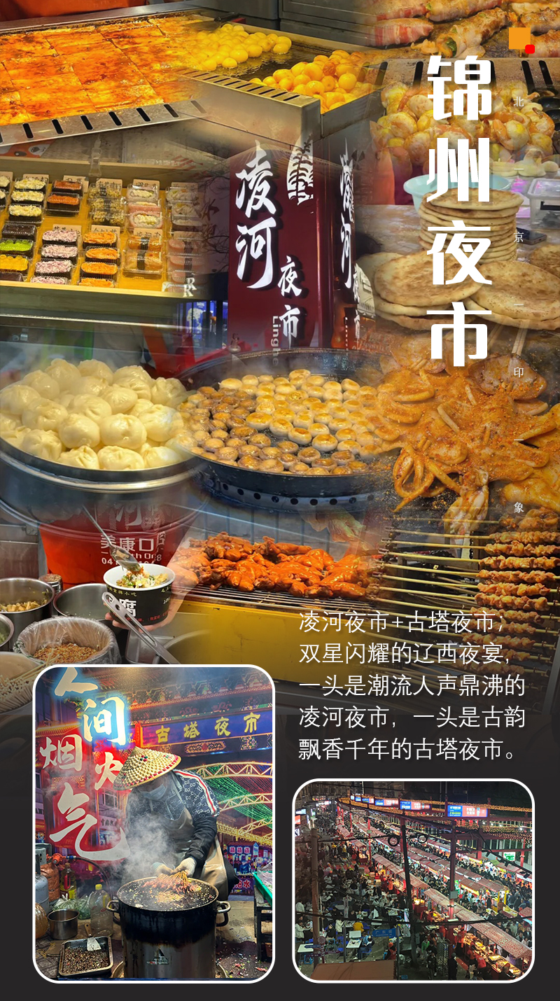 - 晚上抵达『锦州特色夜市』(凌河夜市/古塔夜市)品尝美食,欣赏夜景……